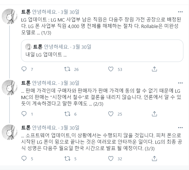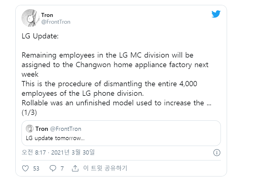 @FrontTron이라는 이름의 한 트위터 사용자는 며칠 전 LG가 자사의 모바일 사업부 직원 4000명을 창원 가전공장에 파견할 계획이라고 말했습니다.