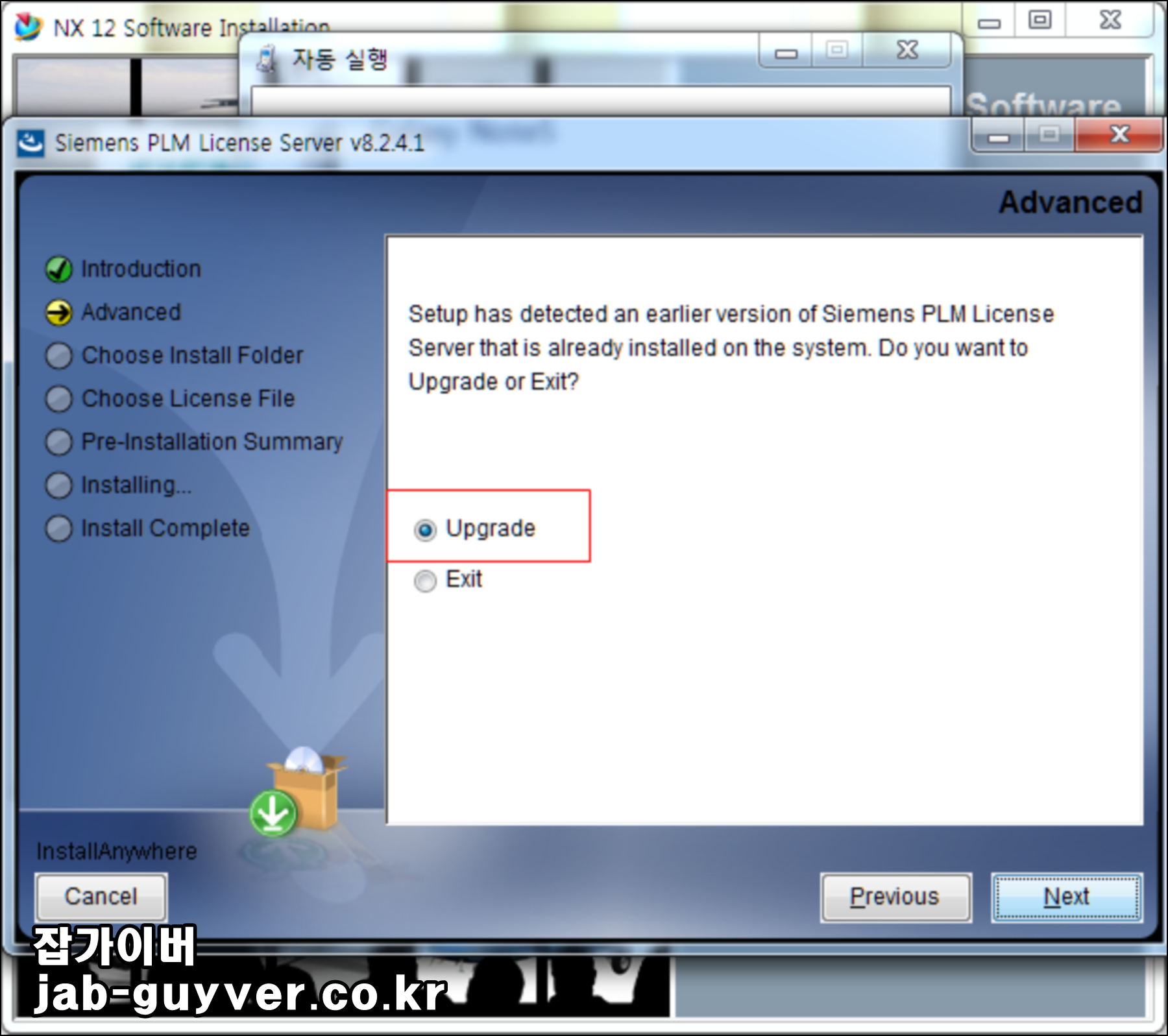 현재 NX11 라이센스가 설치가 되어있는 상태라 업그레이드로 진행합니다 한글 윈도우라 한글로 쉽게 설치를 진행합니다.