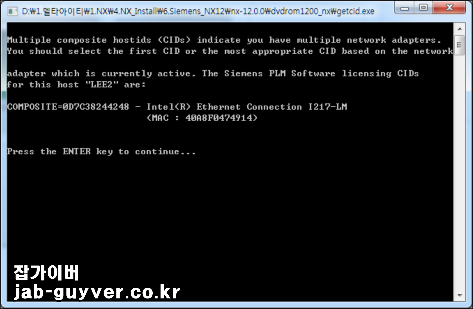 NX 설치 후 초기 화면 또는 LMTOOLS에서 확인 가능하며, MAC 주소 기반으로 생성되므로 노트북처럼 네트워크 어댑터가 자주 바뀌는 경우에는 불안정할 수 있습니다.