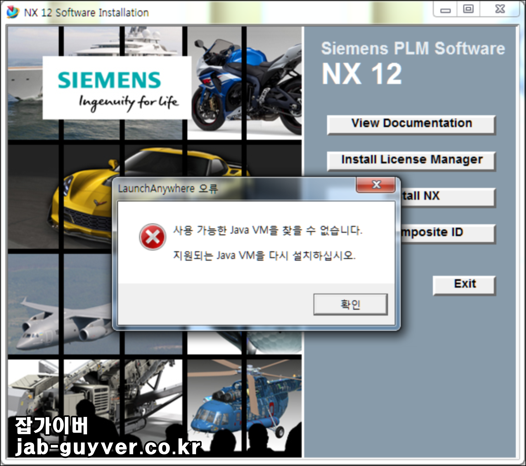 UG NX 설치 중 "사용 가능한 Java VM을 찾을 수 없습니다" 오류가 발생하는데 어떻게 하나요?