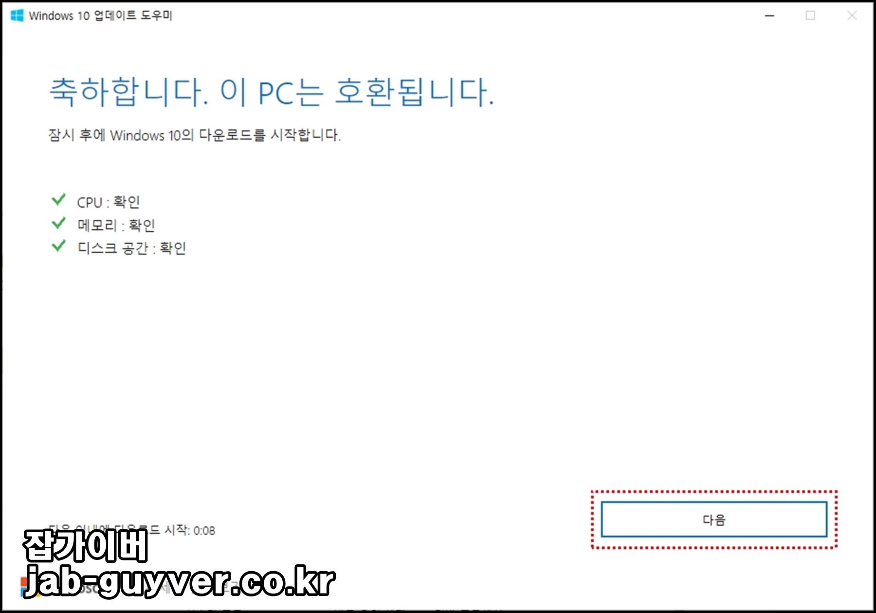 이때 현재 윈도우10 업데이트가 가능한 사양인지 CPU,메모리,디스크공간에 대하여 컴퓨터 사양을 체크합니다.