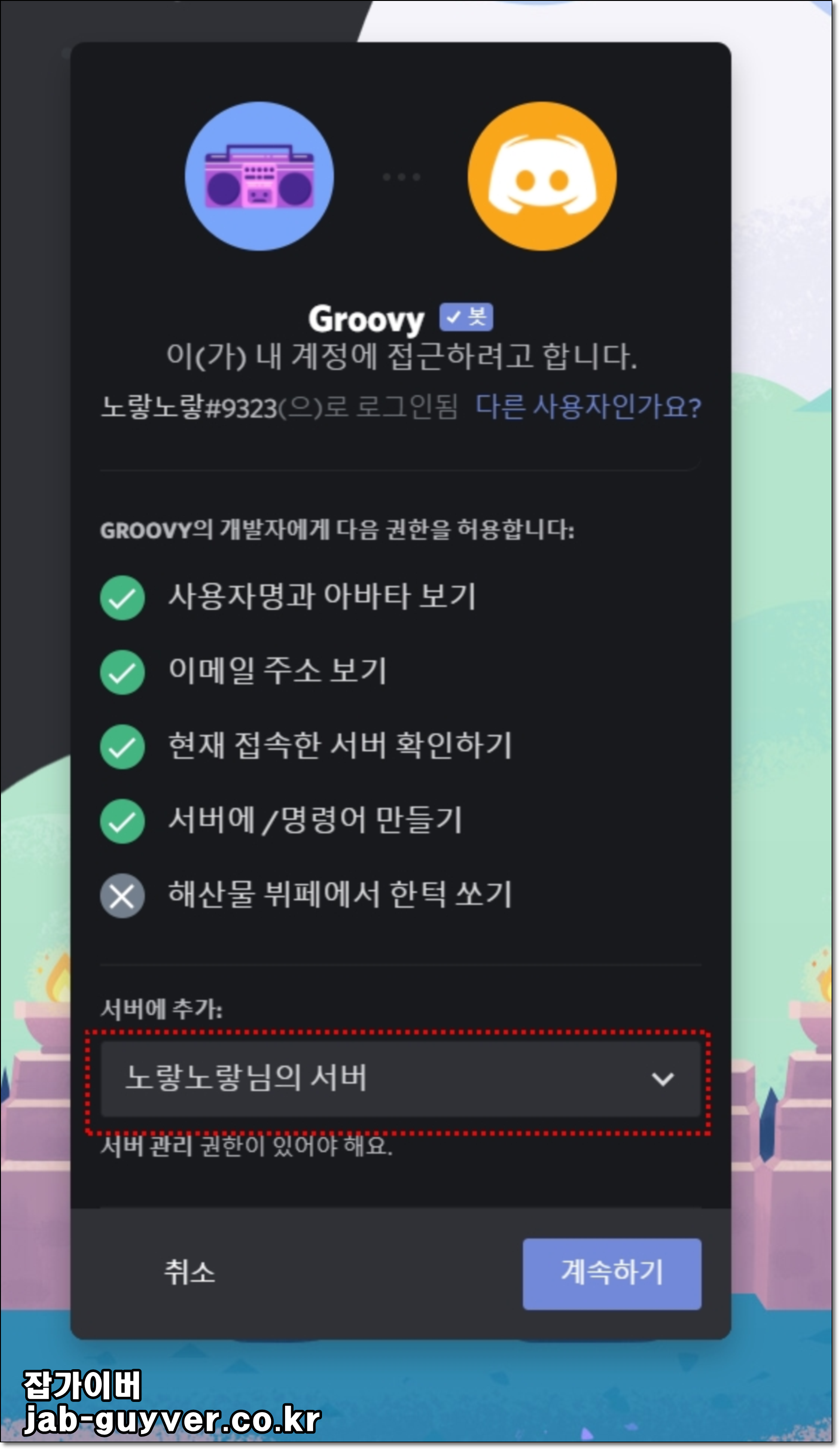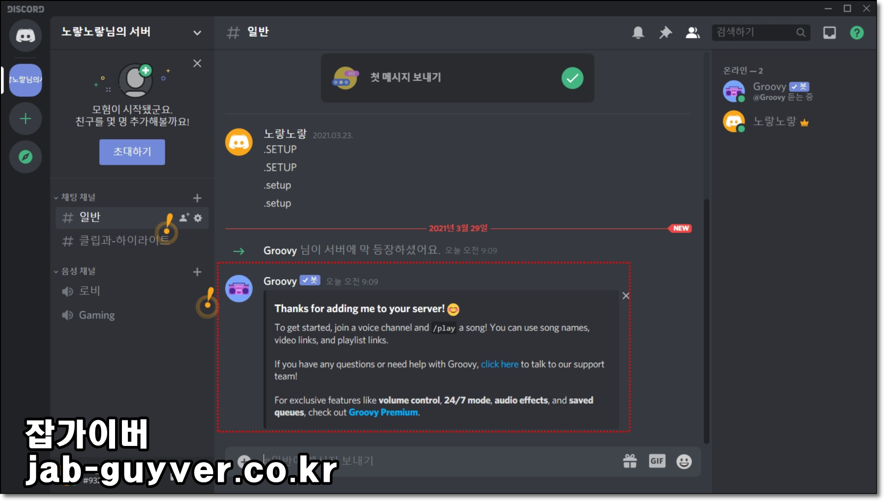 이렇게 그루비 봇 추가되었으면 디스코드 채팅방에 그루비의 글이 추가됩니다.