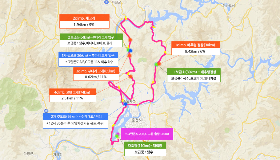 | 1보급소 | 30km | 배후령 정상 | 09:00~10:00 | 춘천 그란폰도 | 생수,초코파이,에너지젤 |
