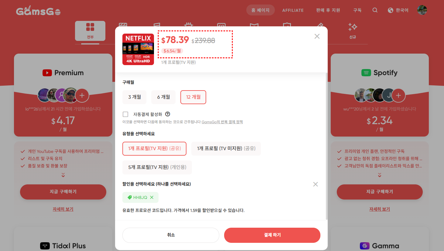만약 넷플릭스 결제 금액이 부담스럽다면 겜스고를 통해 80% 저렴한 가격에 가족공유로 구독이 가능하니 아래 링크를 참고하세요
