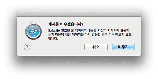 - 캐시 비우기 : 사파리가 웹 페이지를 저장하는 컴퓨터 상의 임시 위치에서 열어 본 웹 페이지를 지웁니다.
