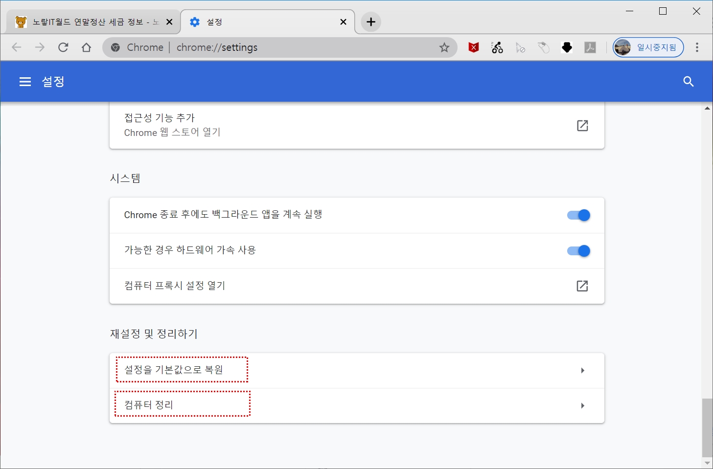 그래도 문제가 해결되지 않는다면 구글 크롬 초기화를 통해 설정을 모두 초기 상태로 되돌립니다.