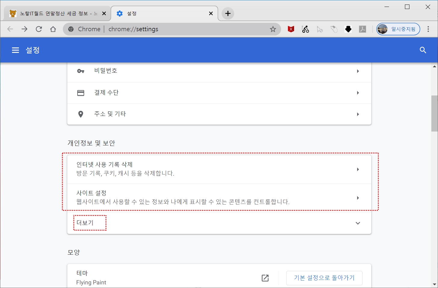 - 방문 기록 지우기 : 열어 본 웹 페이지의 목록을 지웁니다.