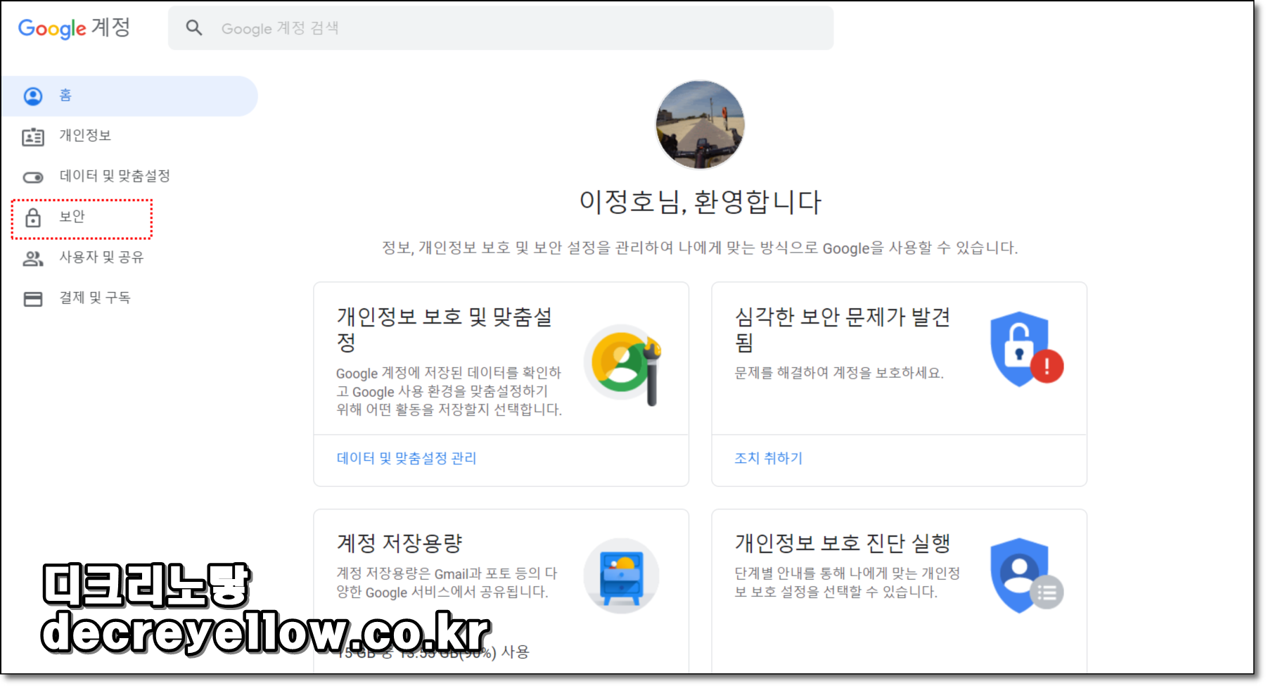 OTP 2단계 인증과 동일하게 구글계정으로 들어가 "보안"을 선택합니다.
