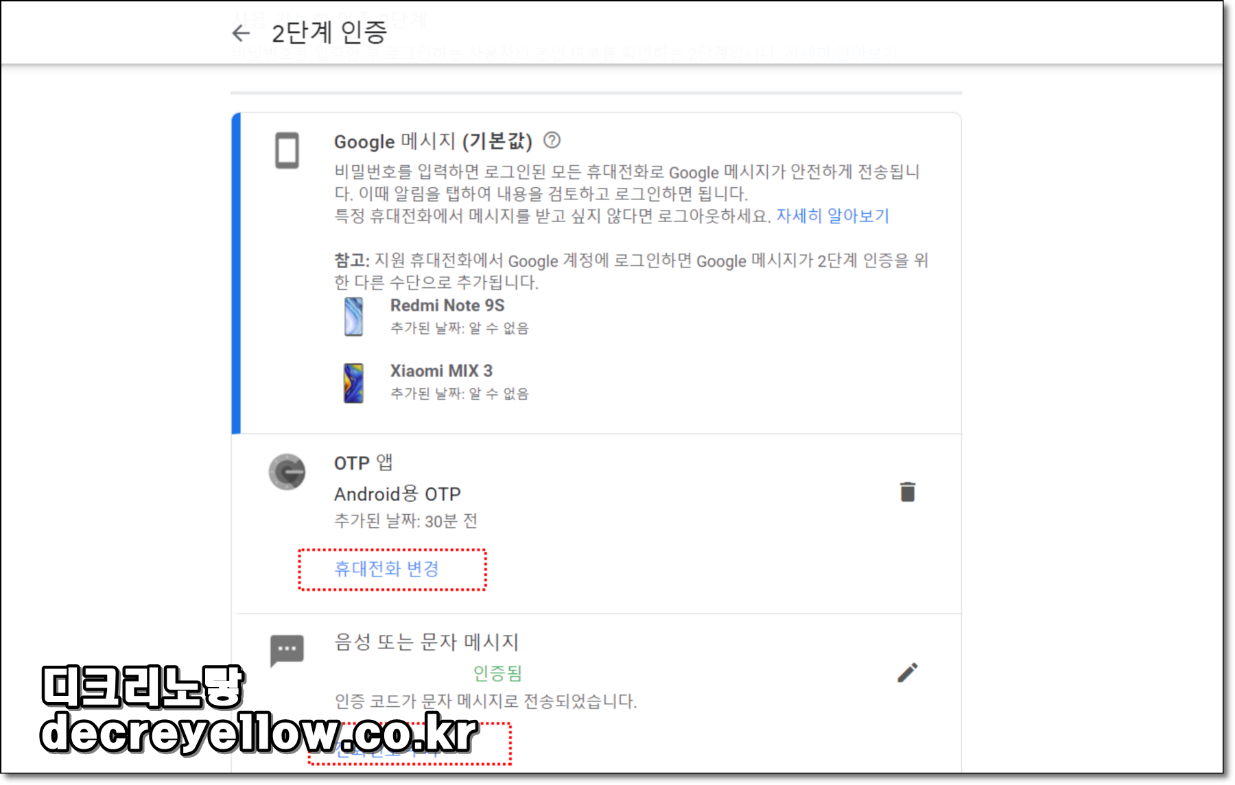 구글 OTP 2단계 인증 전화번호 추가 및 변경 삭제