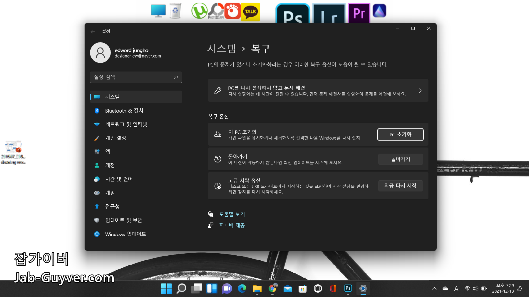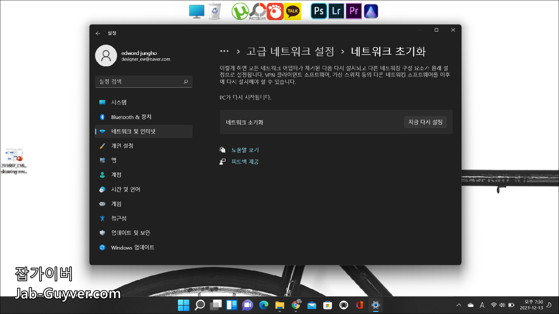 이PC 초기화 -> 네트워크 -> 네트워크 초기화를 선택합니다