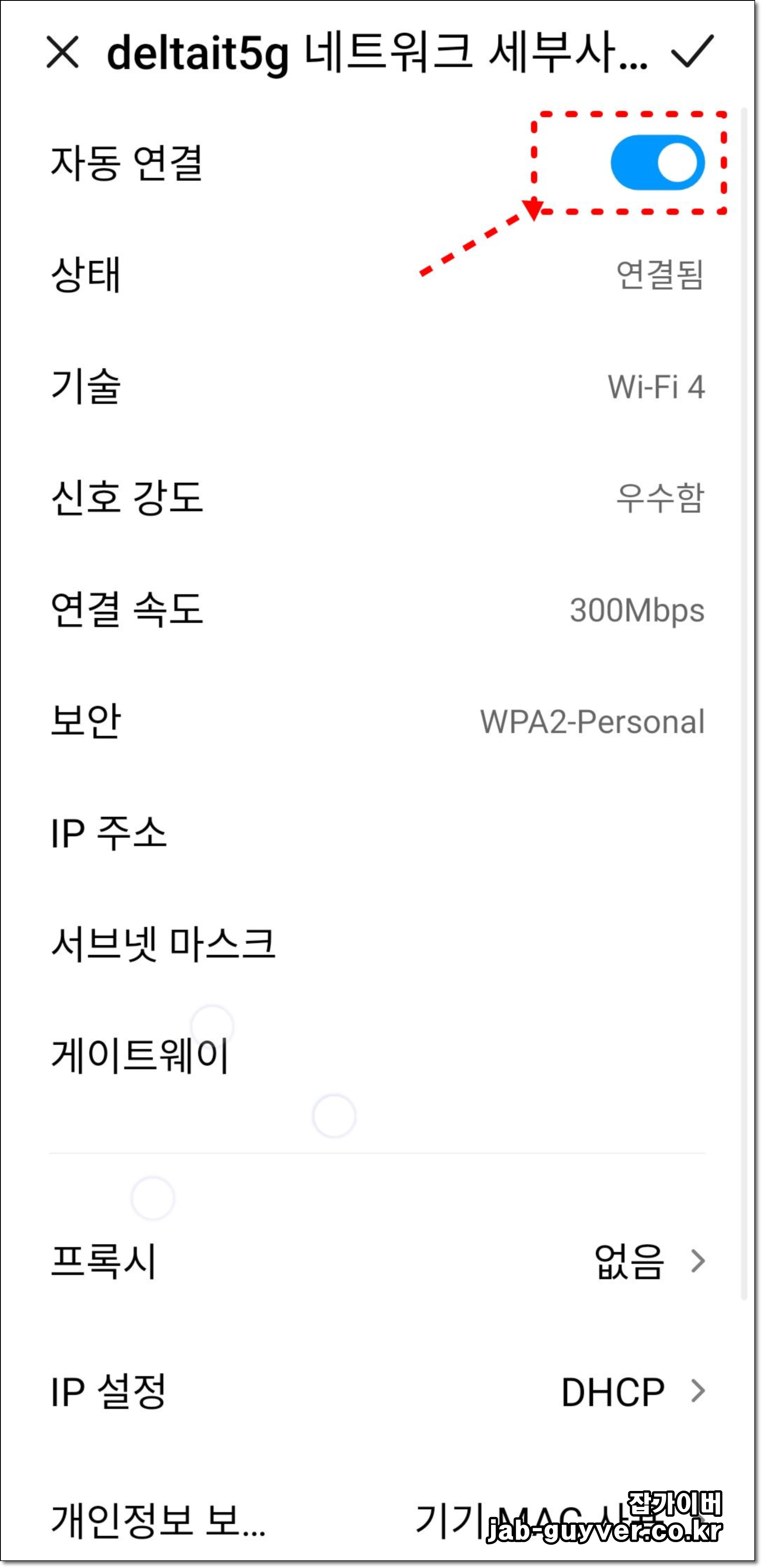 이 상세 화면에서는 자동연결뿐 아니라, 현재 연결된 와이파이의 IP 주소, 게이트웨이, DNS, 링크 속도, 보안 방식 같은 정보도 한 번에 확인할 수 있습니다. 공용망에서 갑자기 연결이 불안정할 때는 여기서 보안 상태와 네트워크 설정을 같이 보는 편이 원인 파악이 빠릅니다.