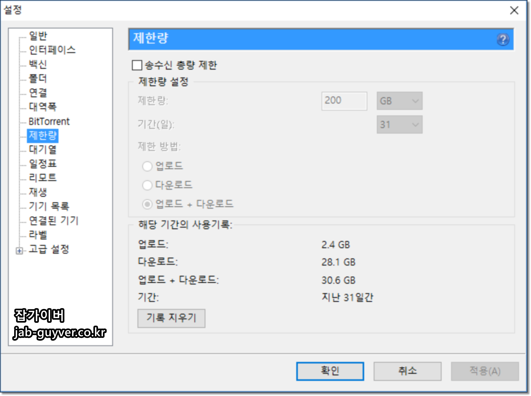 다운 속도가 너무 빨라 컴퓨터가 느려지거나 와이파이 속도까지 너무 깎아먹게 만든다면 여기에서 다운 속도 업로드 속도를 조절하여 와이파이나 다운로드 중 다른 PC의 인터넷 속도에 지장을 주지 않게 합니다.