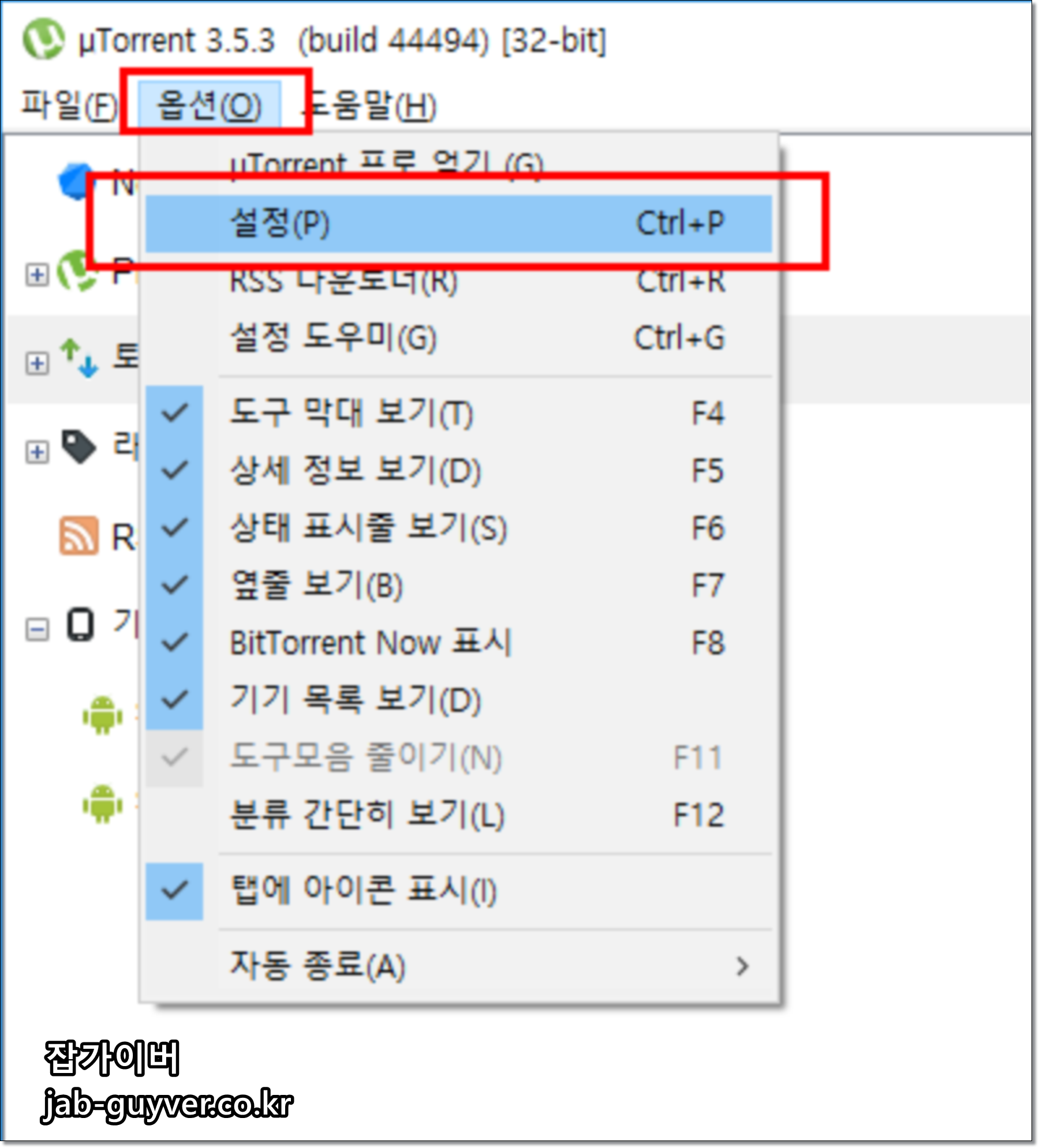 - 그럼 토렌트에서 옵션 - 설정으로 들어갑니다.