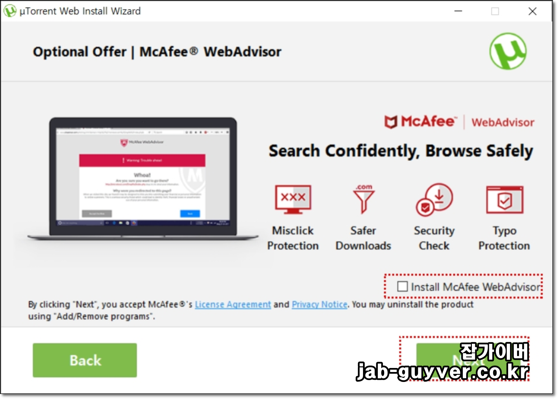 설치 시 웹브라우저에 부가적인 앱이 추가되는데 필요 없다면 모두 체크를 해제합니다.