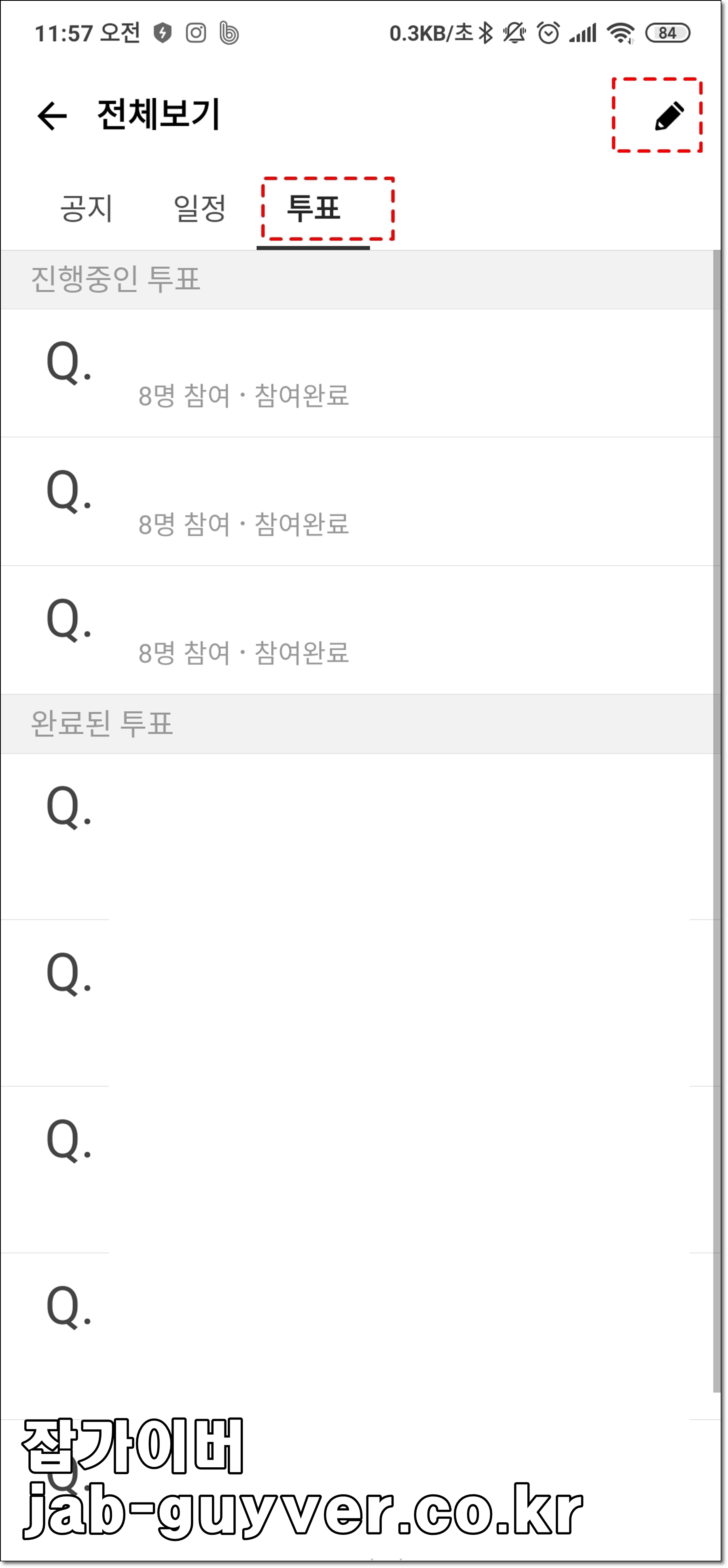 단톡방에 하고 싶은 기능을 선태갛며 투표기능을 선택한 다음 우측 상단 연필 아이콘을 선택합니다.