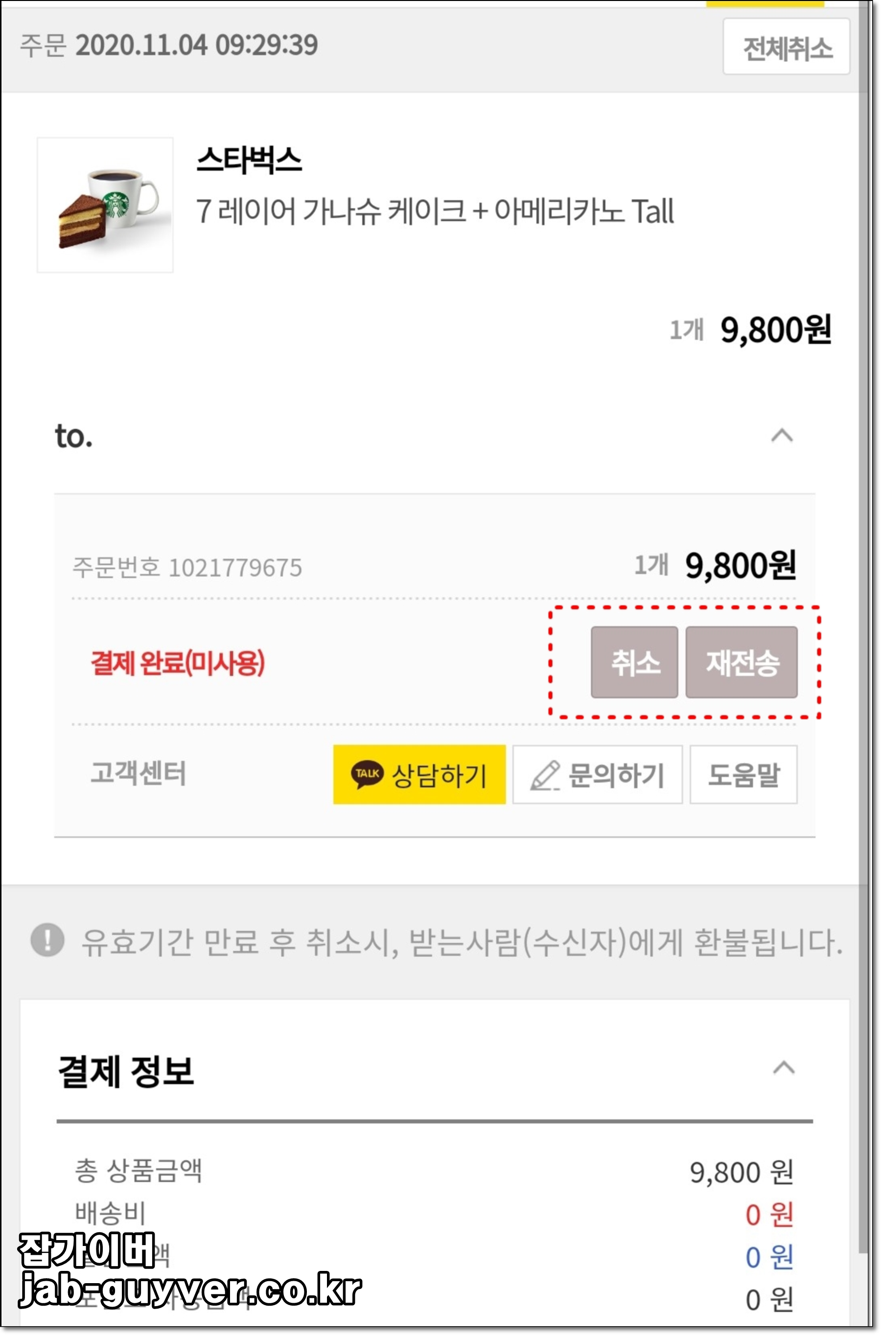 그 외에도 결제정보를 취소하거나 다시 재전송할 수 있으며 유효기간 만료 후 취소 시에는 받는 사람에게 환불이 됩니다.