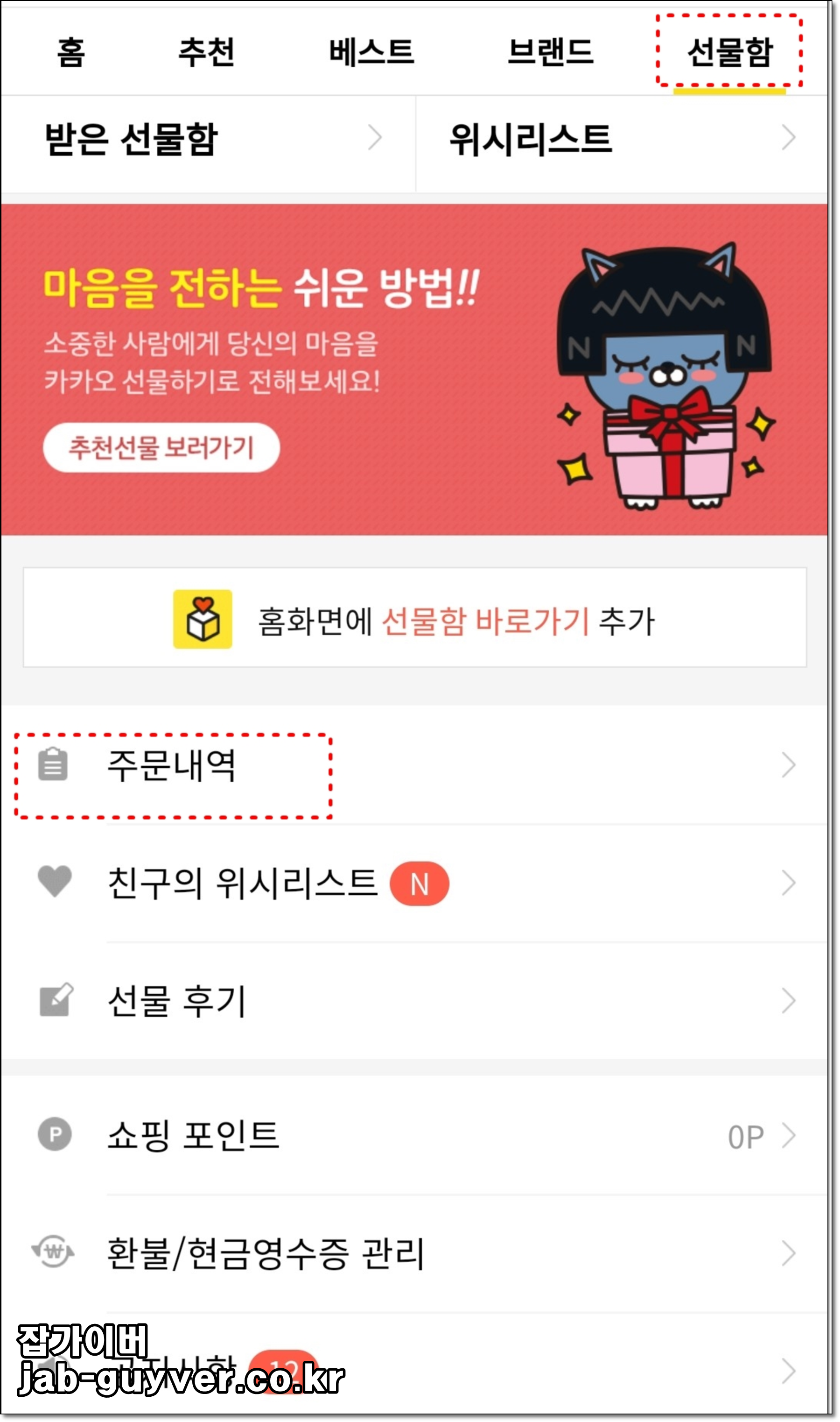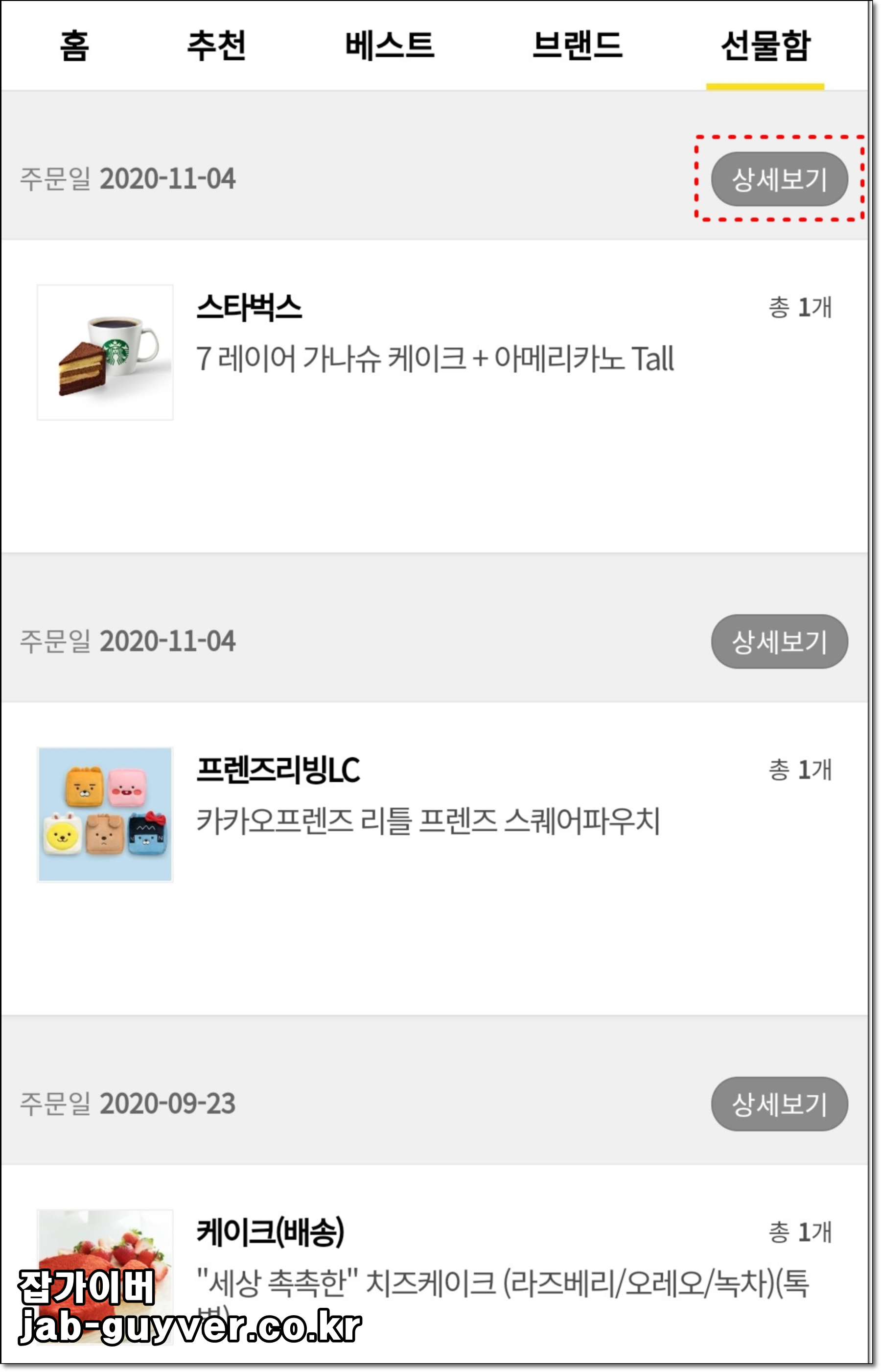 이렇게 결제한 내역은 주문내역에서 확인 가능하며 선물이 마음에 들지 않는다면 결제 취소를 통해 환불받을 수 있습니다.