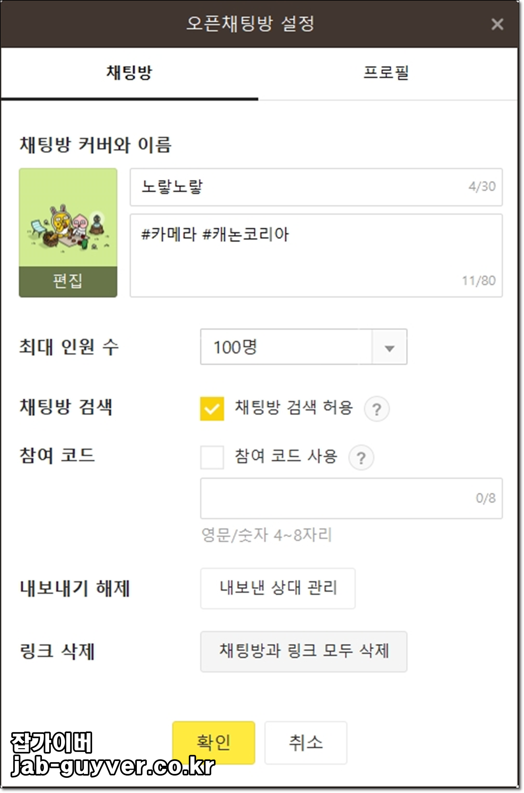 오픈채팅방을 만든 관리자라면 채팅방의 인원수 및 참여코드를 통해 암호를 설정할 수 있습니다.