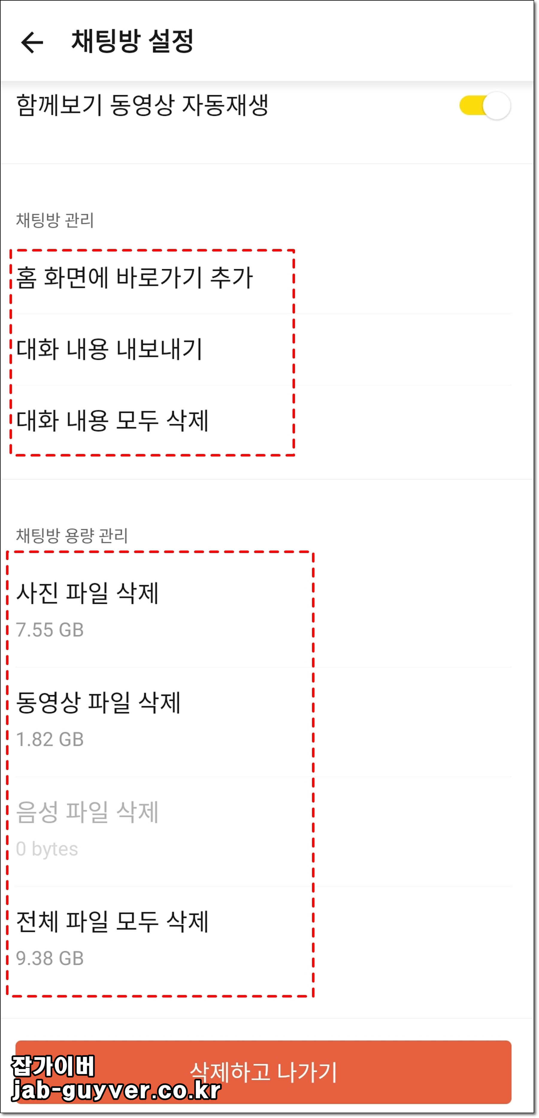 카카오톡에서 용량을 관리하고 확보하기 위해서 지금까지 카카오톡 방의 사진 및 동영상 대화내용등을 모두 삭제합니다.