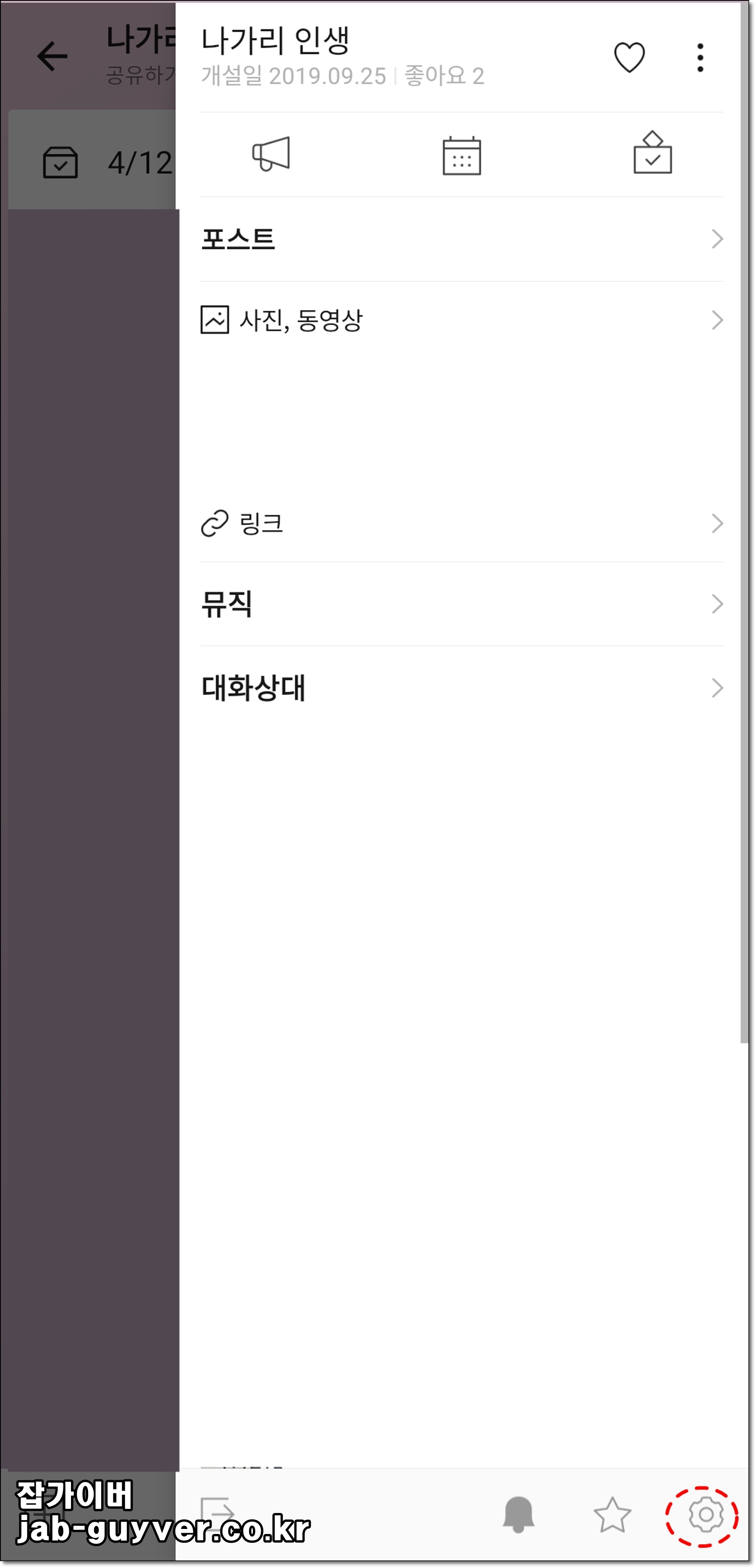 - 카카오톡 앱 실행 후 우측 상단의 기어 아이콘을 선택하여 설정 창으로 이동합니다.