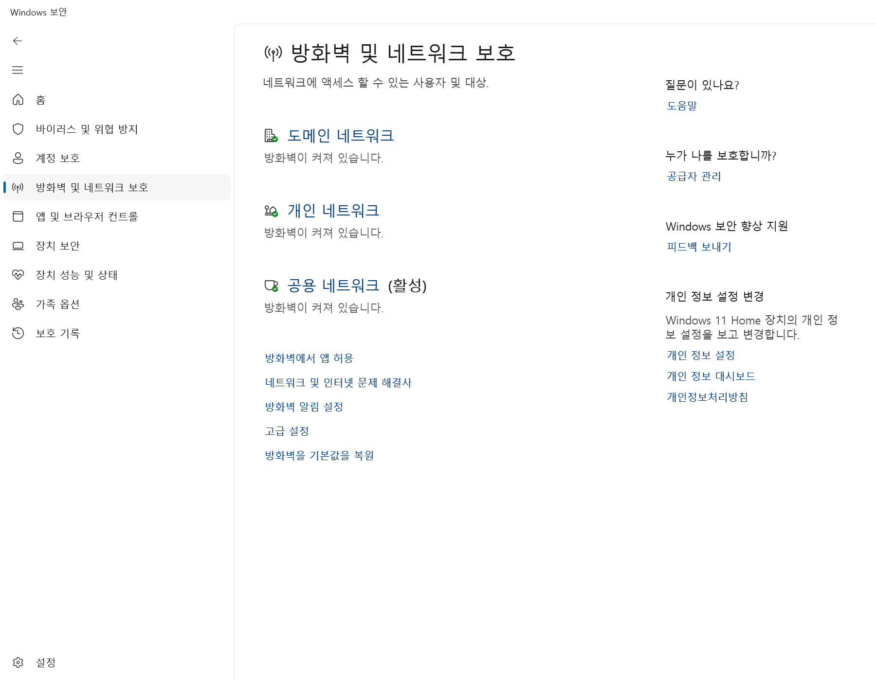 윈도우 디펜더와 Windows 방화벽은 별도의 기능입니다. 디펜더를 비활성화해도 방화벽은 그대로 동작하며, 타 백신을 설치해도 방화벽까지 자동으로 꺼지는 경우는 많지 않습니다. 특히 회사·학교·원격 접속 환경에서는 방화벽이 매우 중요하므로, 백신과 달리 웬만하면 그대로 유지하는 쪽이 훨씬 안전합니다.
