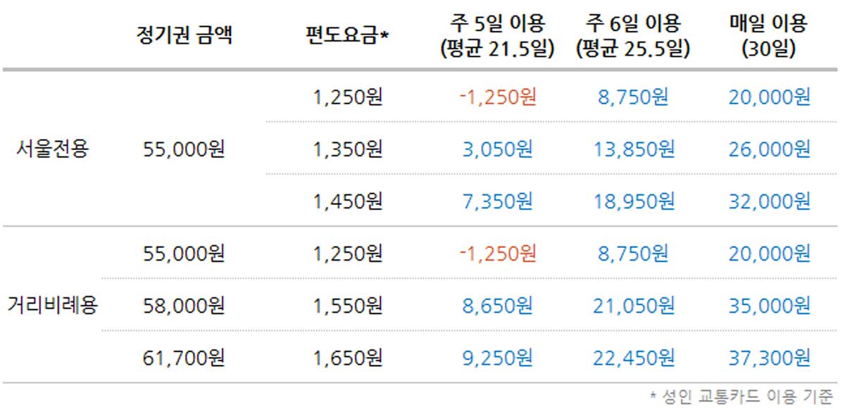 - 지하철 정기권 가격 : 55,000원 (교통카드 기본 운임 기준 1,250원 x 44회)