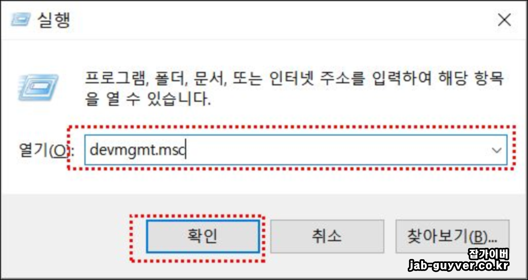 열기 항목에서 "devmgmt.msc"를 입력 후 확인을 눌러줍니다.