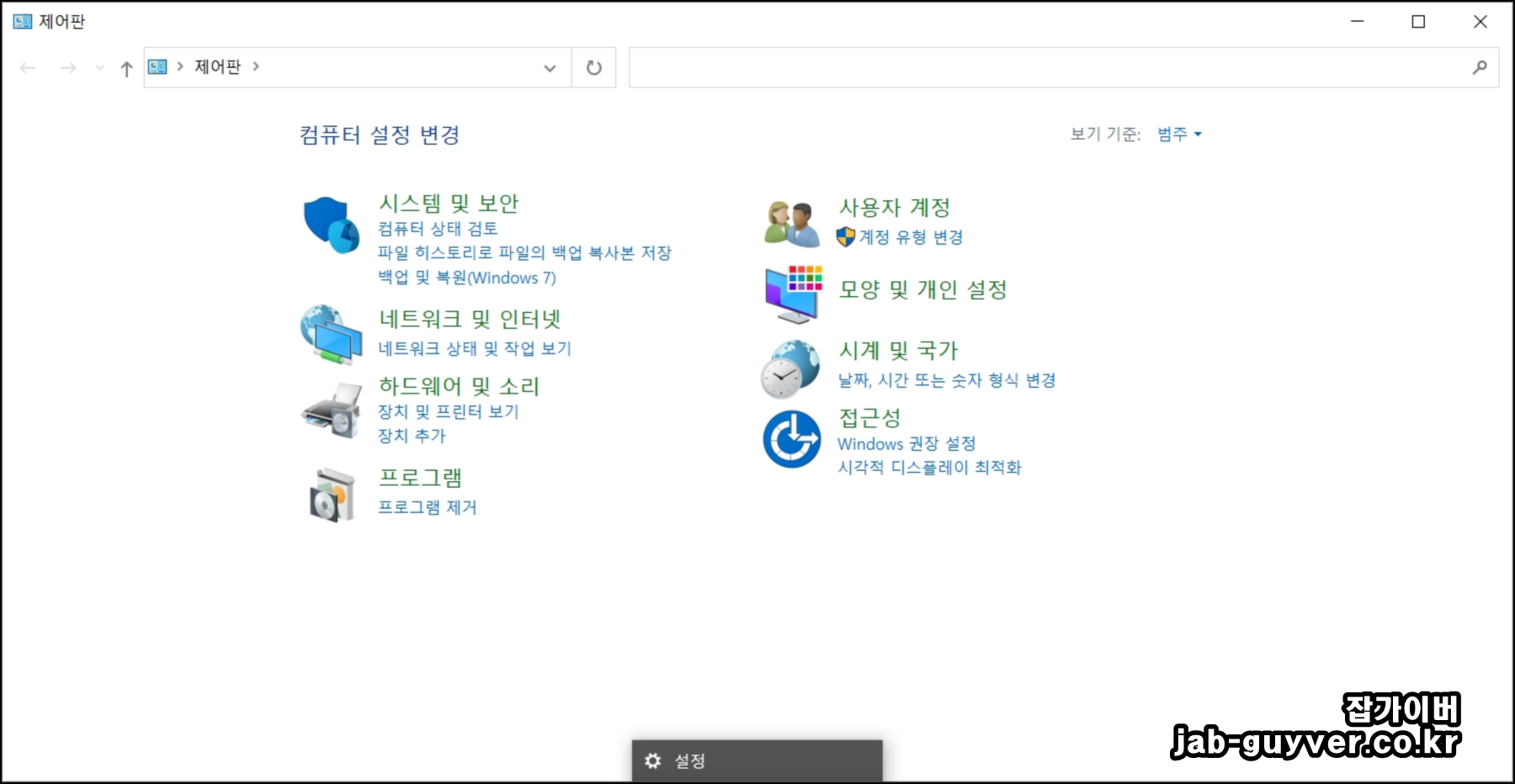 검색이 되지 않는다면 보기 기준 -> 범주를 큰 아이콘으로 변경합니다.