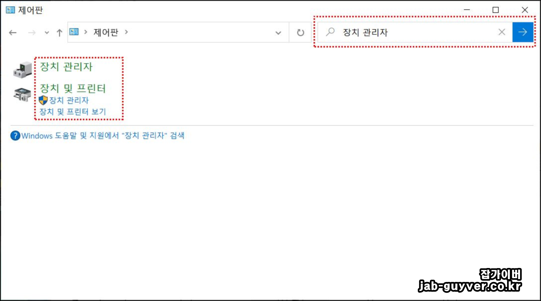 제어판 실행 후 상단에 검색 부분에 "장치관리자"를 입력해서 검색합니다.