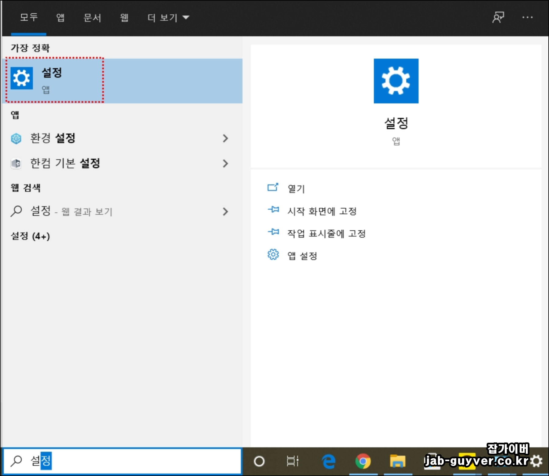 새롭게 바뀐 Windows10에서는 설장라고 입력합니다.