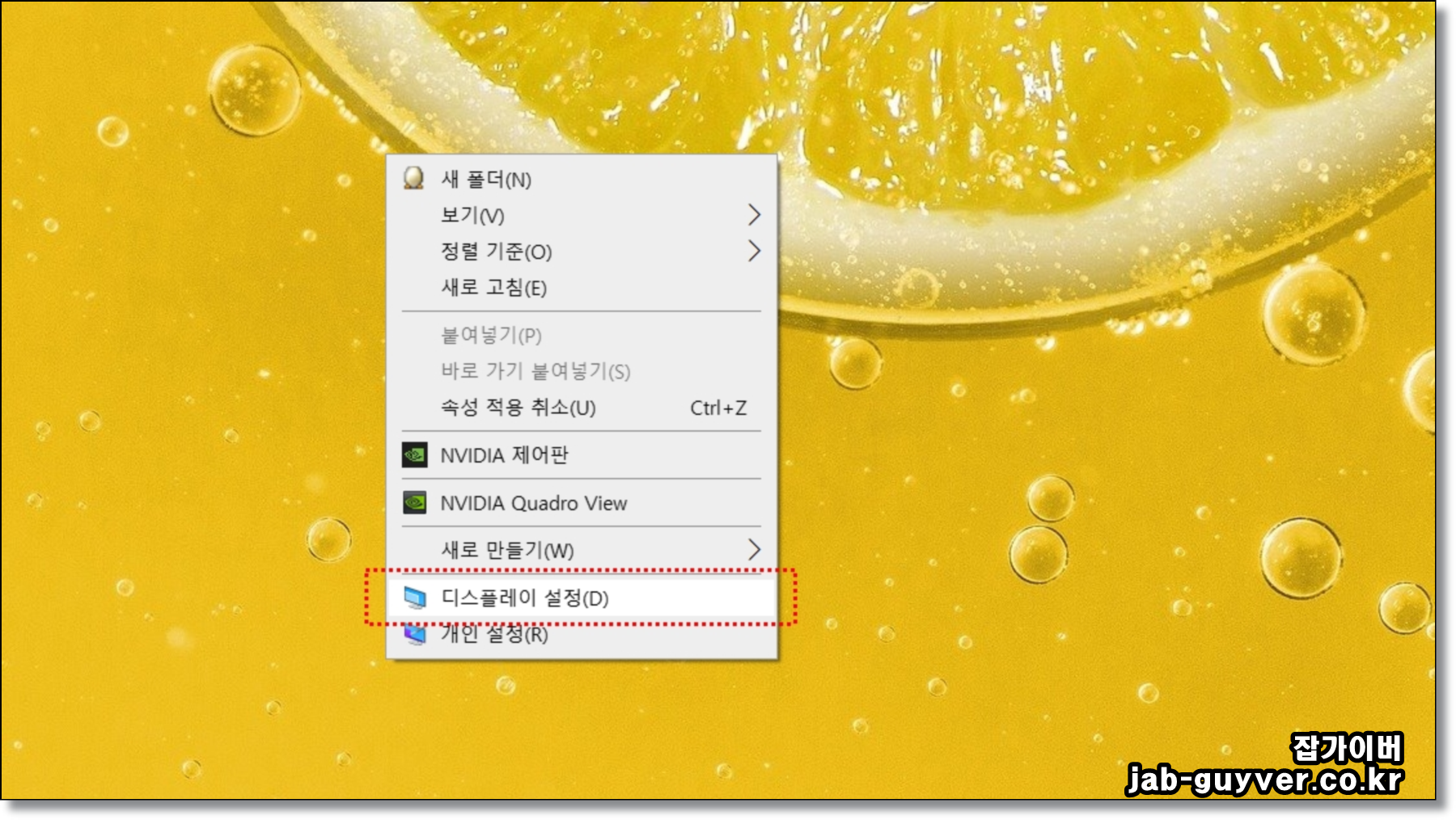 - 바탕화면의 빈 곳을 마우스 우클릭해서 디스플레이 설정을 선택합니다.