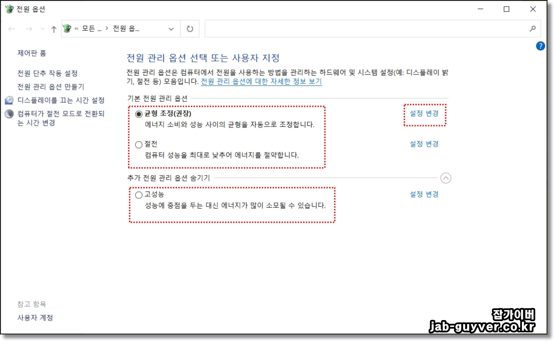 전원 설정에서 절전모드 옵션 자체가 안 보이는 경우는 보통 고성능 전원 계획이 설정되어 있거나, 시스템 정책이 제한되어 있는 경우 발생합니다.