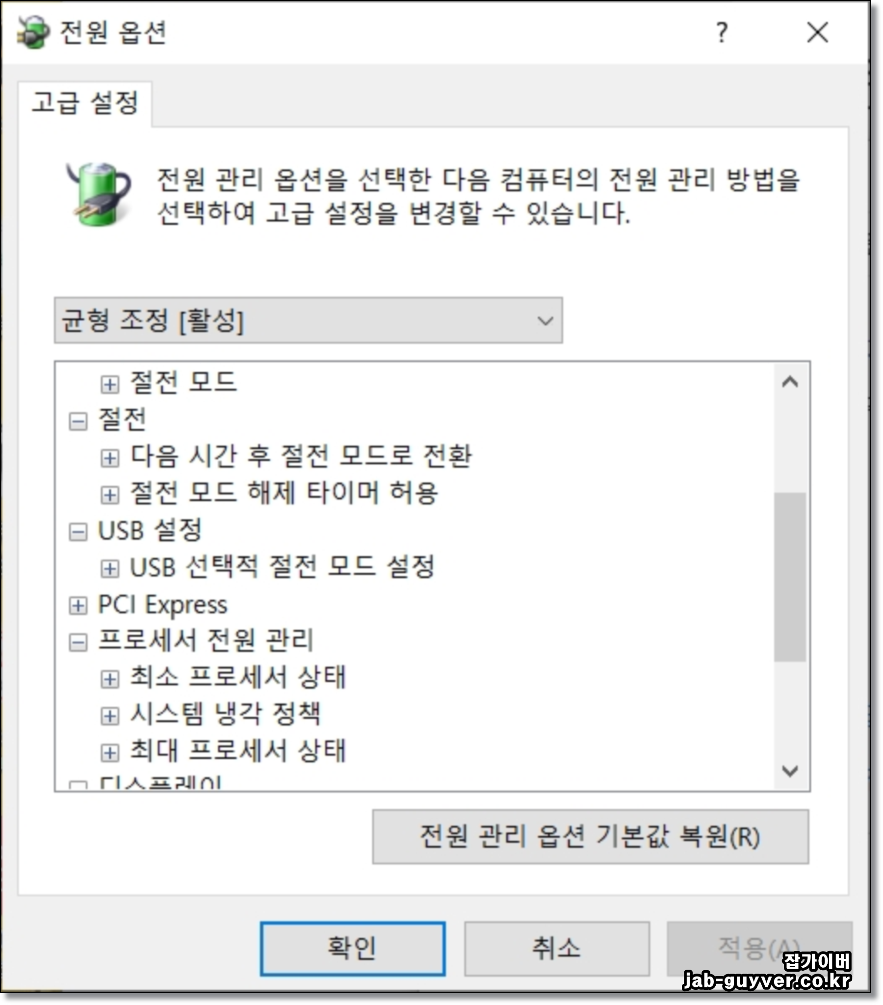 - 고급 전원 설정에서 “USB 설정 → USB 선택적 절전 모드 설정”을 사용 안 함