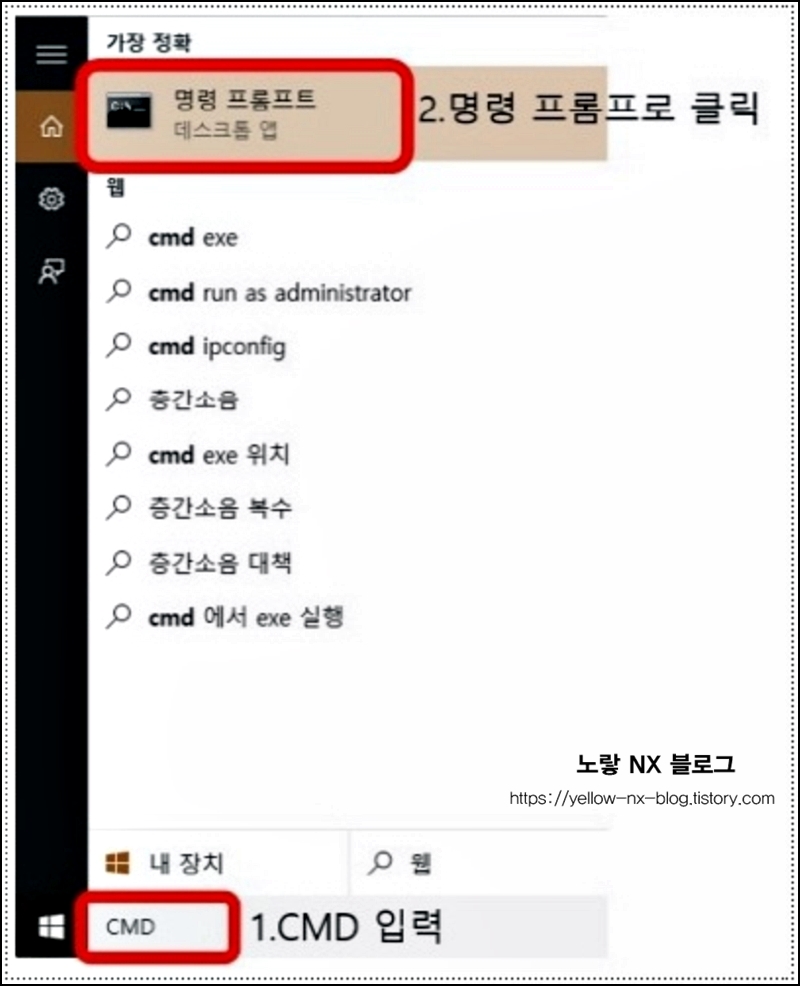 - 먼저, 컴퓨터에서 윈도우 키를 누른 후 검색창에 "CMD"를 입력합니다.