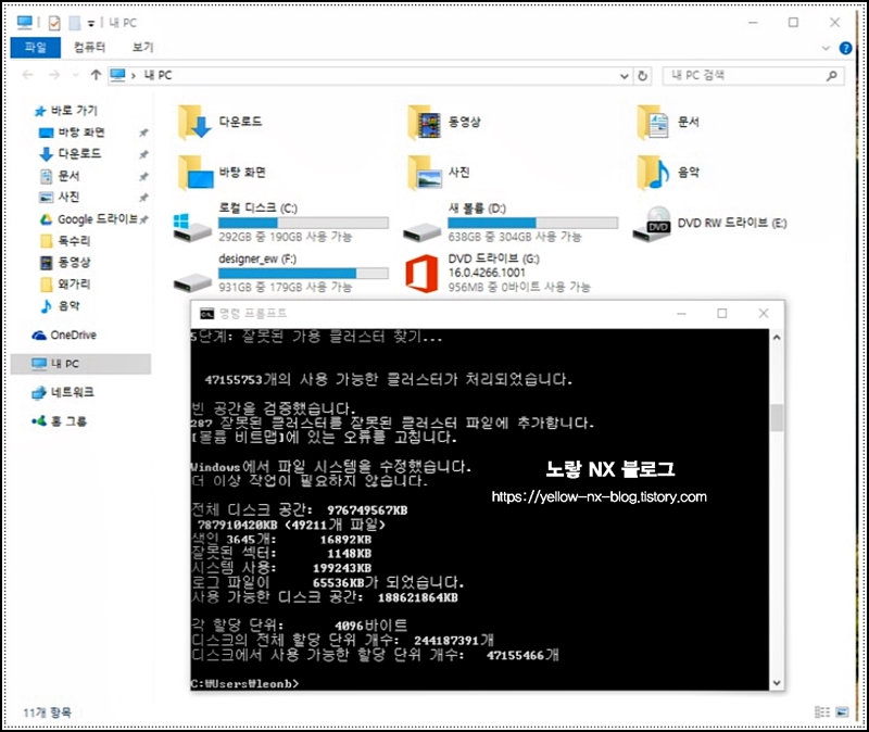 다른 드라이브(예: E)도 같은 증상이면 아래처럼 바꿔서 실행합니다: