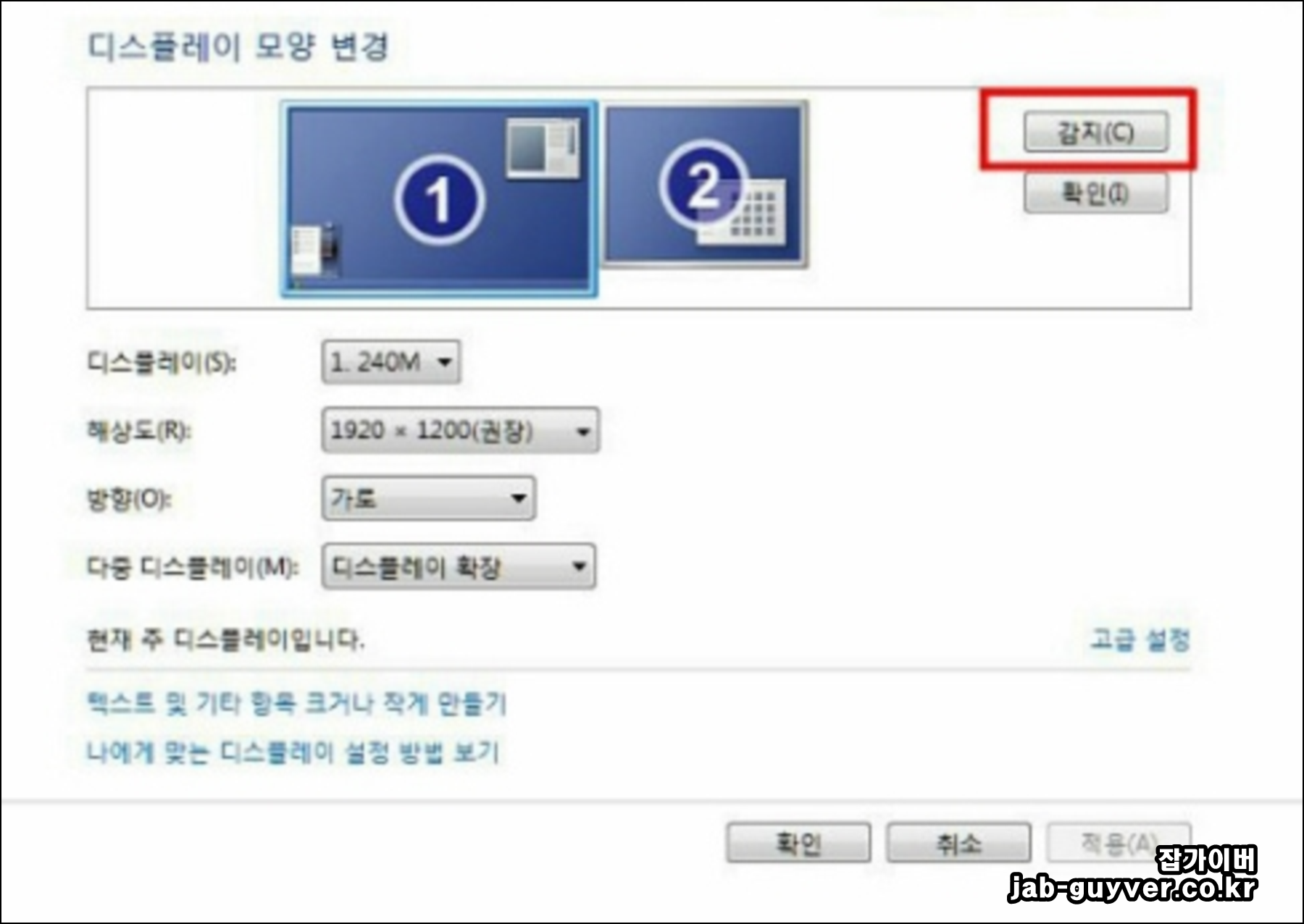 - 만약 케이블을 모두 연결했지만 듀얼모니터가 인식되지 않는다면 감지 버튼을 눌러 줍세요