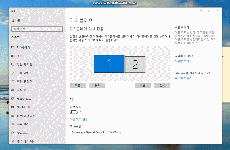 - [디스플레이 설정 > 감지] 버튼 클릭