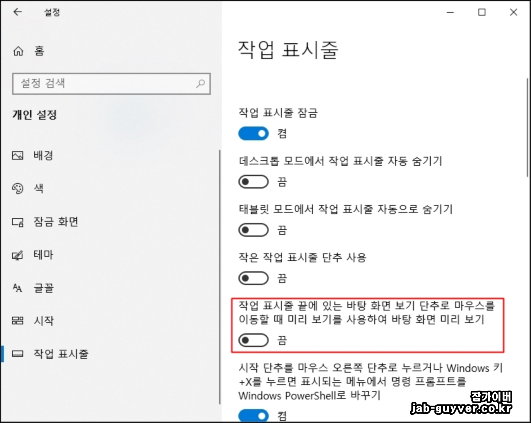 작업표시줄 부분에 작업표시줄 끝에 있는 바탕화면 보기 단추로 마우스를 이동할 때 미리 보기를 사용하여 바탕화면 미리 보기 부분을 체크합니다.