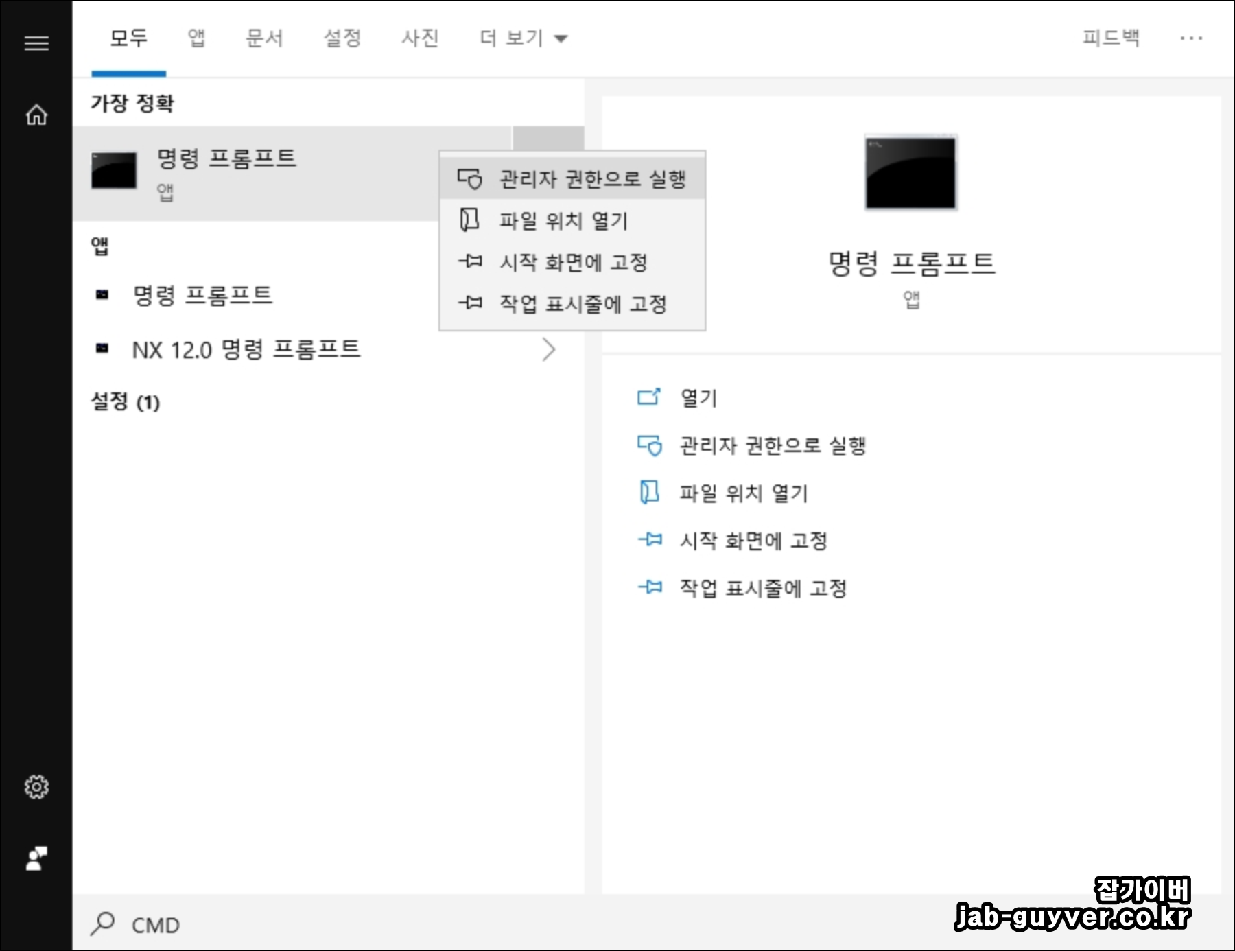 그리고 명령프롬포트라고해서 일반적으로 CMD를 실행해 다양한 기능을 수행하는데 일반 권한에는 제약이 있기 때문에 관리자 권한으로 실행하는 것이 좋습니다.
