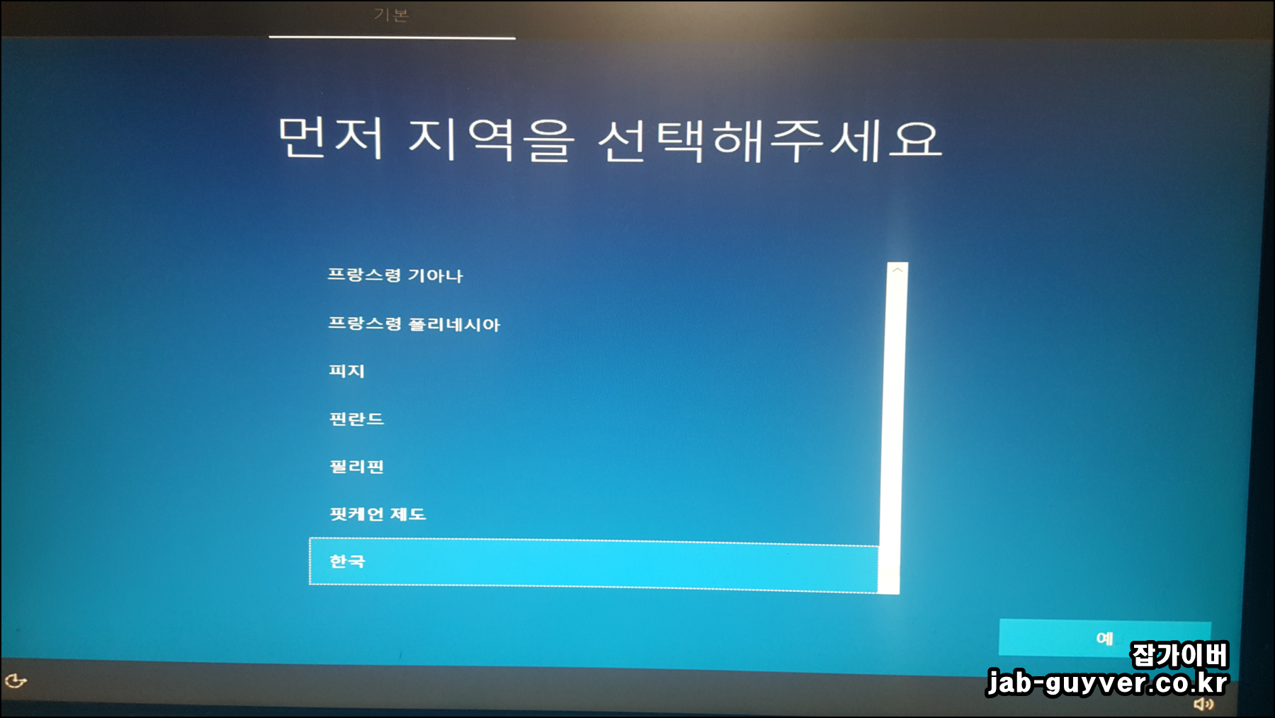 재부팅 후에는 지역 선택, 자판 배열 같은 기본 설정을 하게 됩니다.