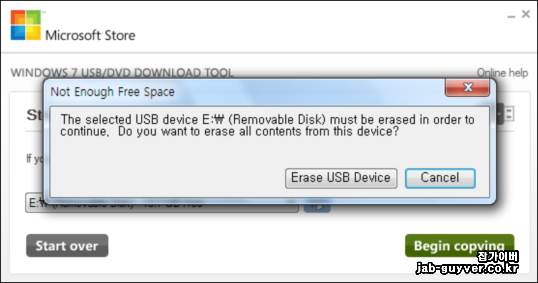 마지막으로 [Begin Copying]을 누르면 작업이 시작됩니다. 이때 주의할 점은 USB 안에 있는 모든 데이터가 삭제된다는 것입니다. 중요한 파일이 있다면 미리 백업해 두시고, [Erase USB Device]를 눌러 초기화와 함께 굽기를 진행하세요.