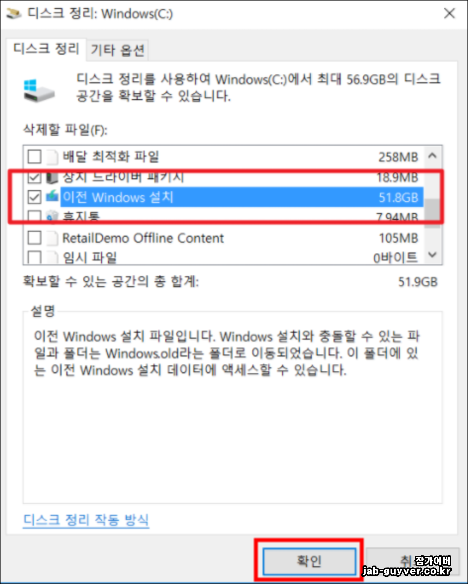 그러므로 Windows.OLD 파일을 삭제하면 기존의 윈도우 상태로 되돌릴 수 없는 단점이 있지만 윈도우를 업데이트 한 다음 며칠 사용 후 문제가 없다면 굳이 옛날 버전의 윈도우로 돌아갈 일이 없기 때문에 삭제하는 것을 추천합니다.