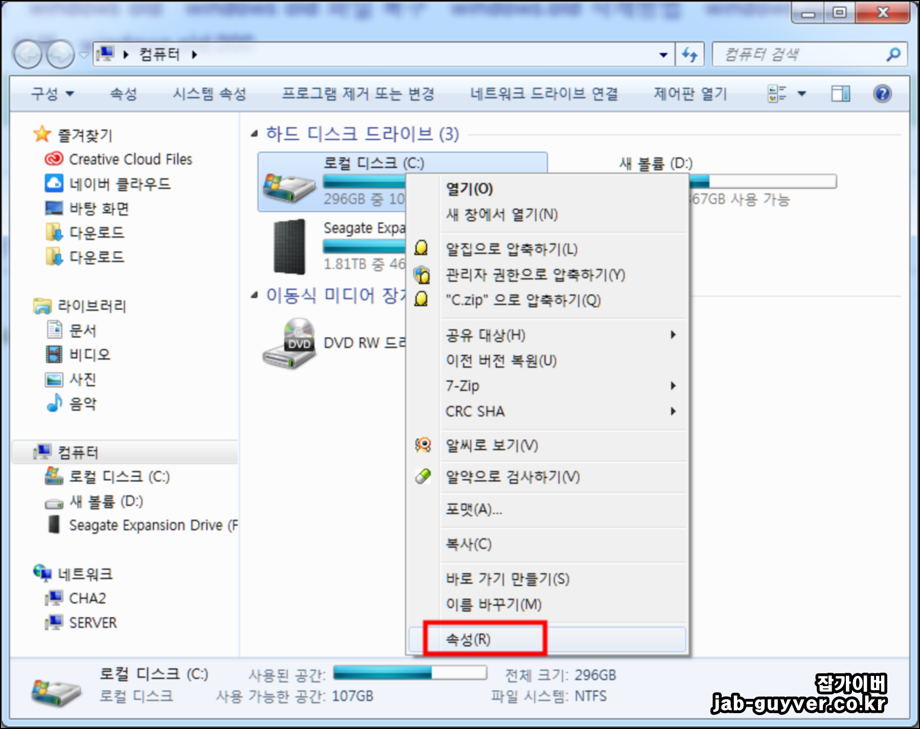 - "Windows.OLD 파일"을 삭제하기 위해서는 윈도우가 설치된 드라이브를 선택 후 마우스 우 클릭하여 속성으로 들어가자