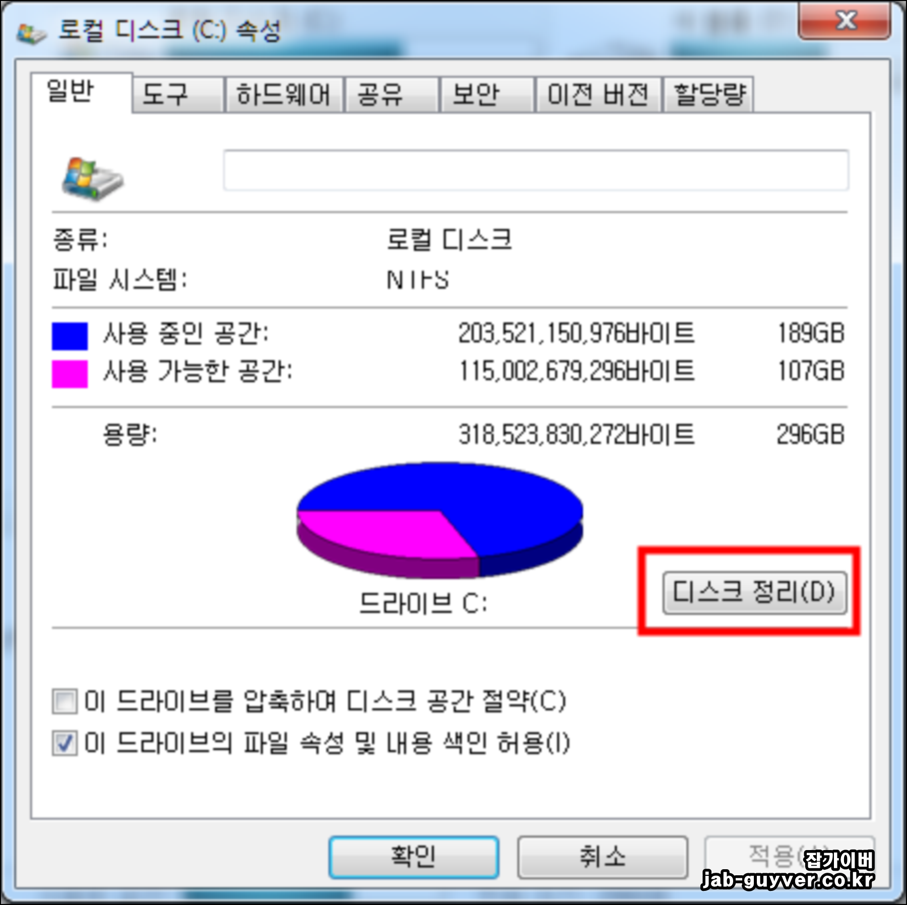 - 드라이브 속성으로 들어간 다음 디스크 정리 탭을 선택하자