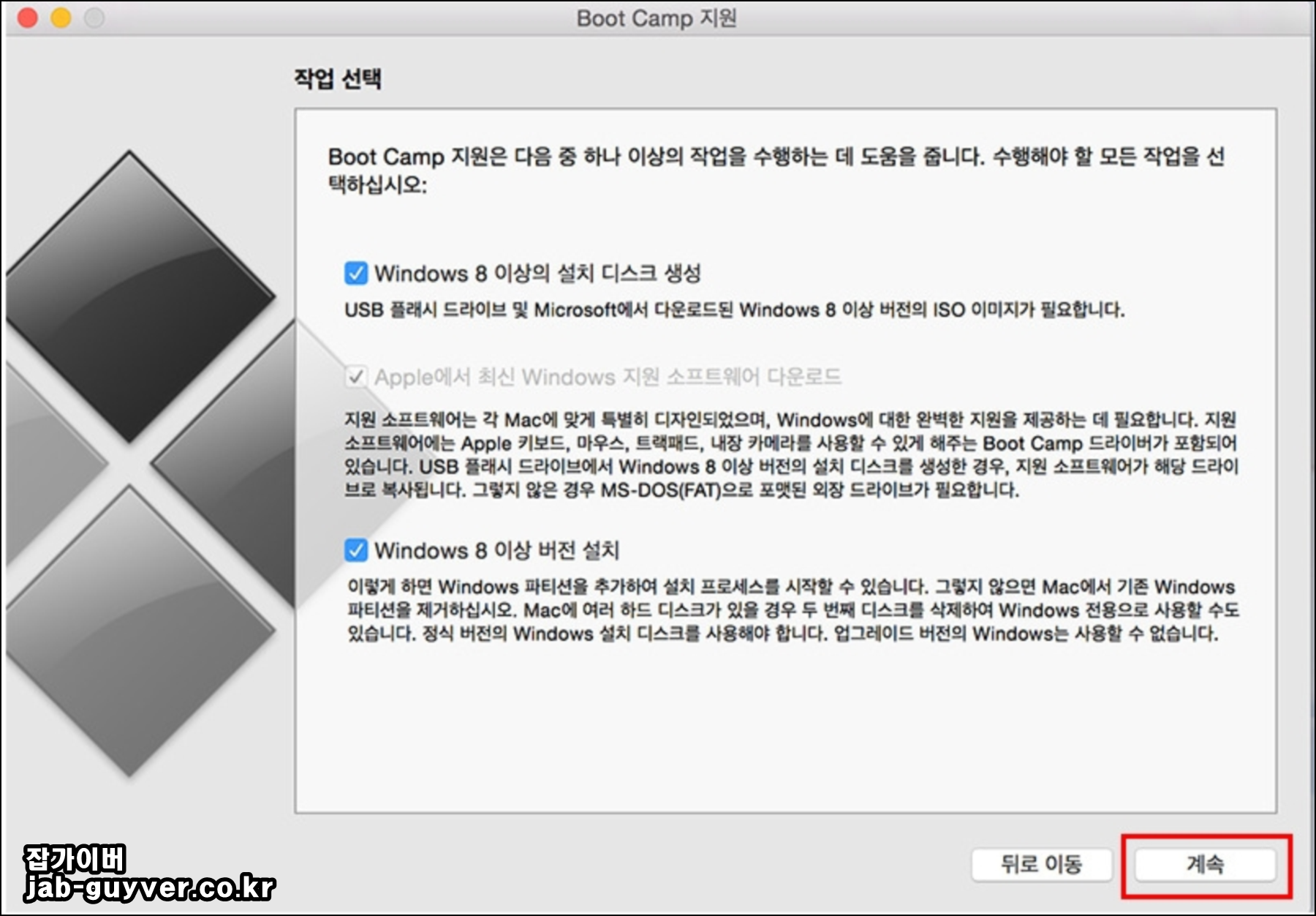 - 부트캠프를 이용하면 윈도우8 이상의 설치 디스크 설치가 가능합니다.