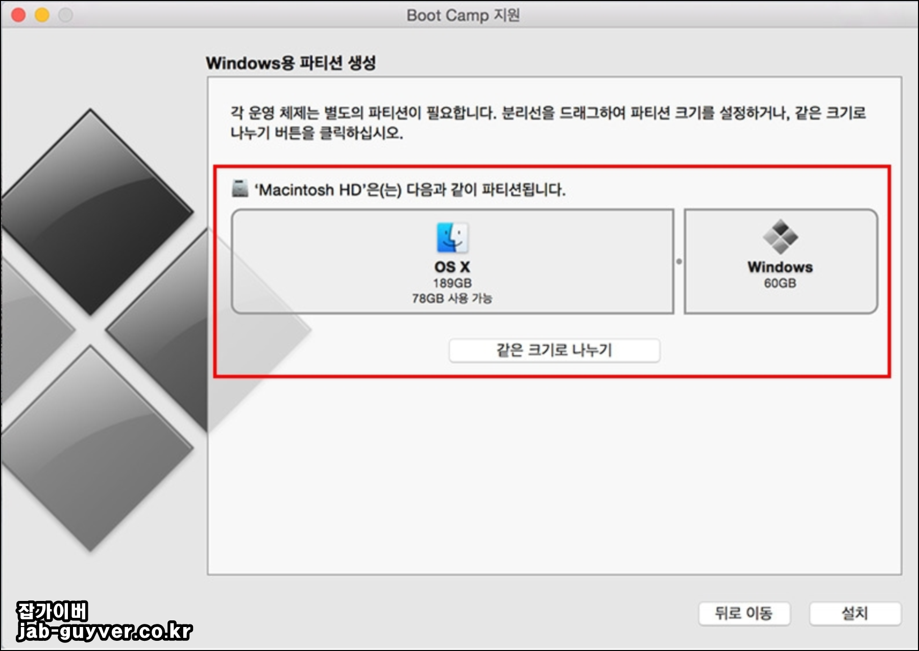 다음 윈도우용 설치 파티션을 생성하기 위해서 보는 것과 같이 OS X와 별도로 다른 위치에 WINDOWS 를 설정해줍니다.