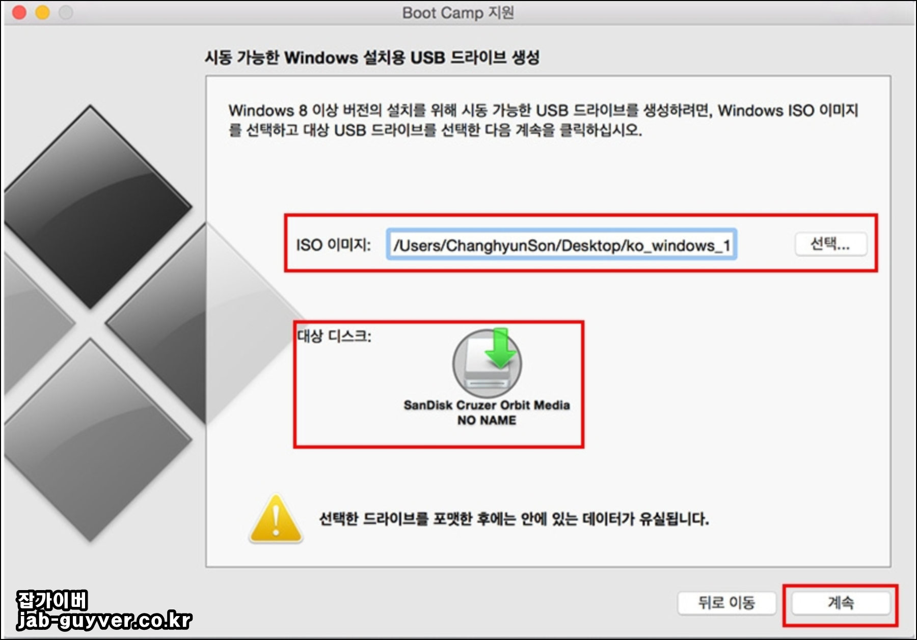 - 가상 윈도우 파일을 설정 후 계속을 누르면 설정된 해당 USB 드라이브를 지워집니다.