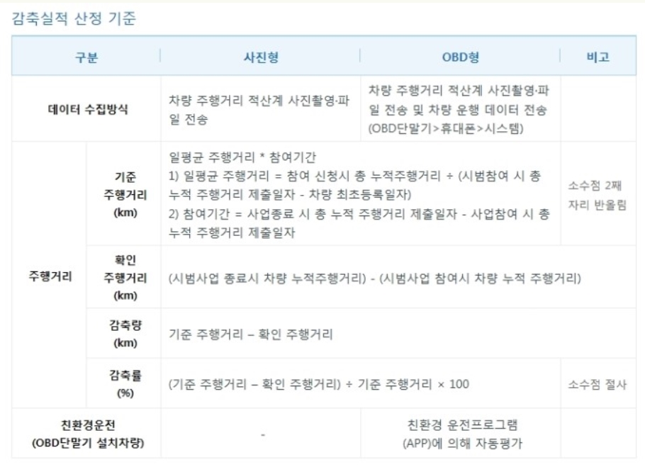 | 감축률 | (기준 주행거리 – 확인 주행거리) ÷ 기준 주행거리 × 100 | 소수점 절사 | ||