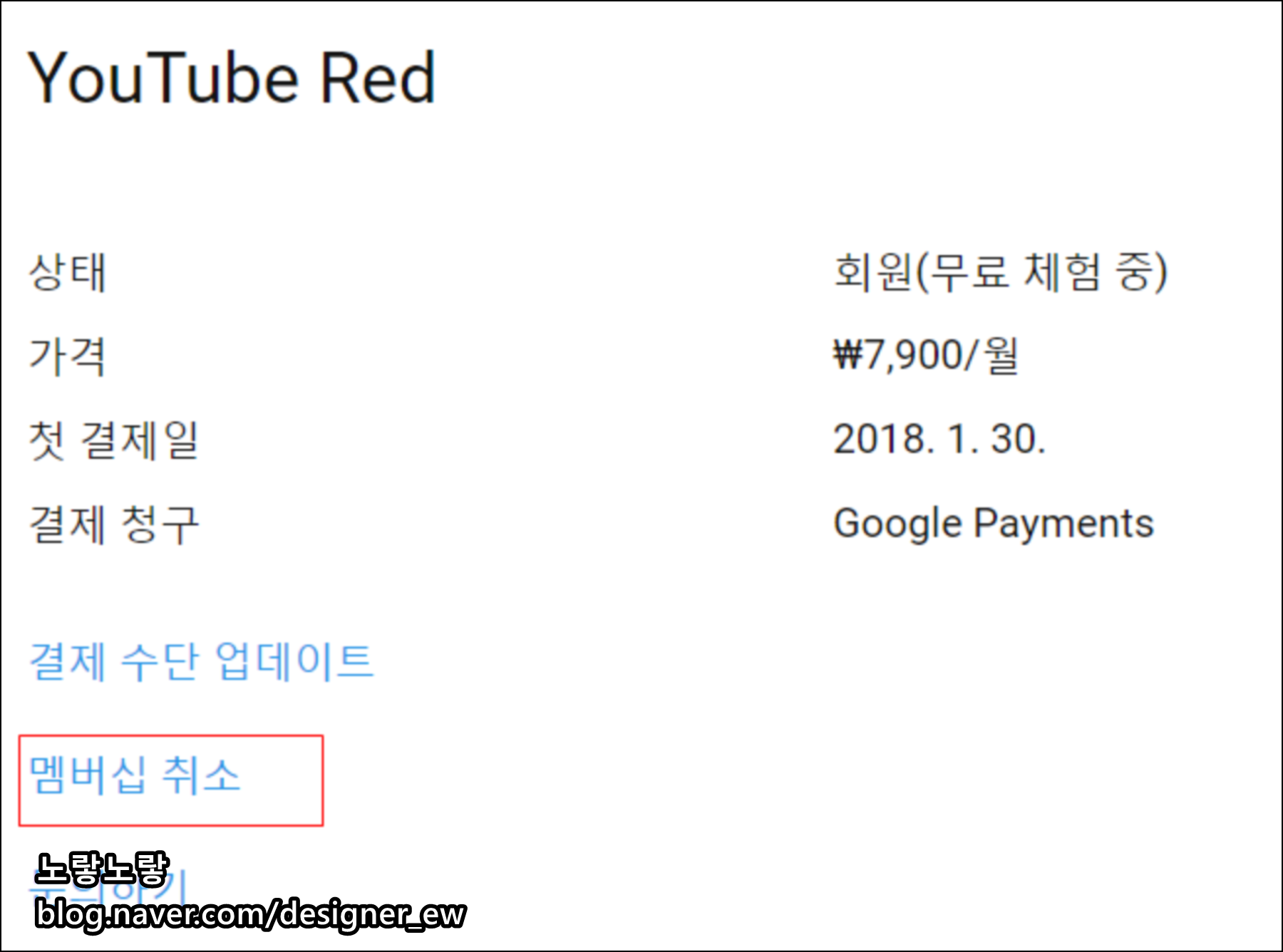 그럼 현재 유튜브 프리미엄의 상태를 보면 계정해지가 되어 취소 된 것을 볼 수 있습니다.