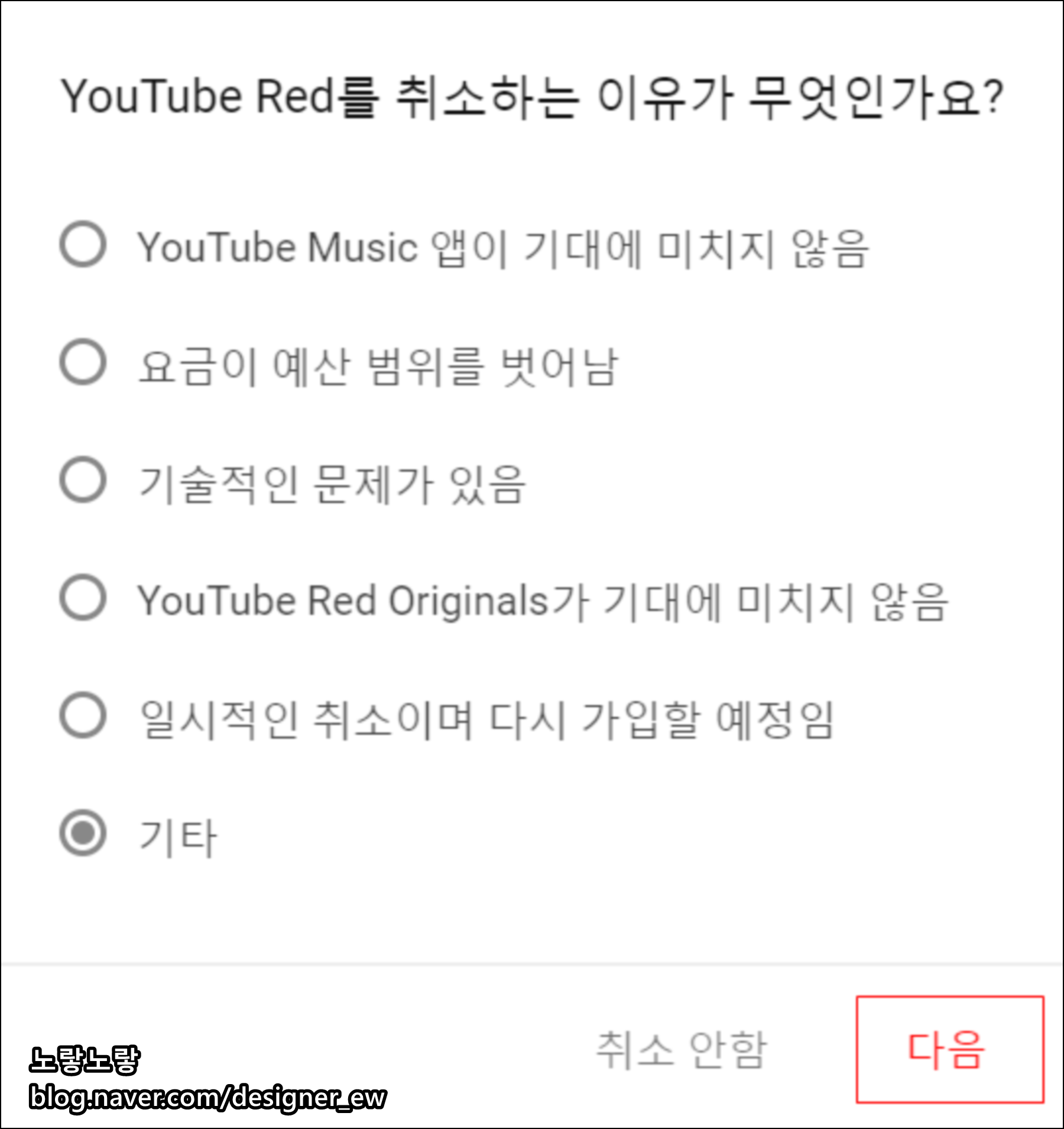 그럼 유튜브 레드를 취소할까요를 취소안함과 취소라는 헷갈리는 말이 뜹니다